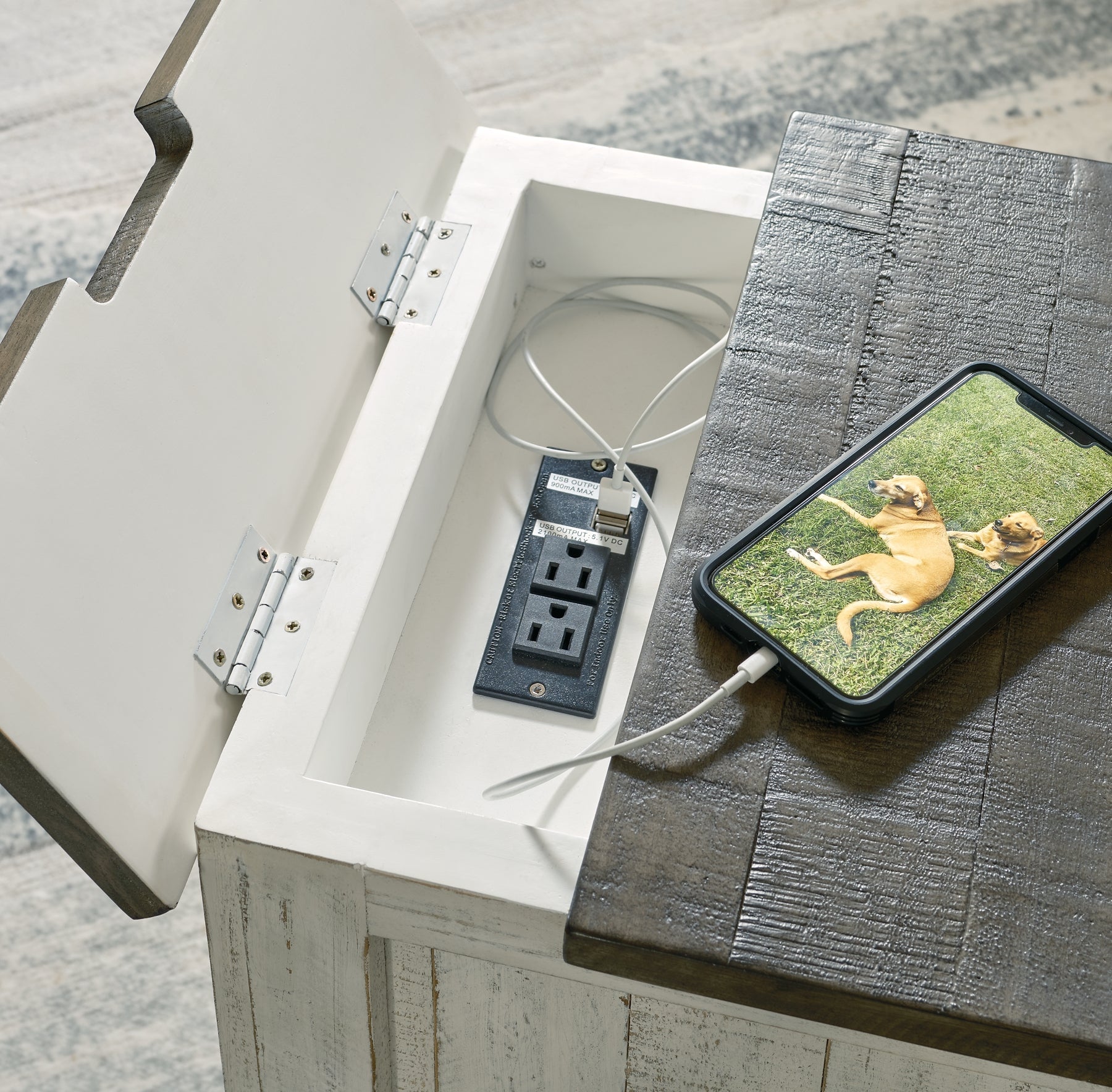 Casual farmhouse design. Made with Pine solids and veneer with engineered wood substrate. Two-tone finish scheme with distressed weathered gray tops on a vintage white cases. The lift-top cocktail table features four storage drawers, two large drawers on front and two smaller drawers on the sides. A small concealed storage tray under the lift-top for seldom used items. Square end table with a drawer and lower open shelf. A small flip-lid located on the top of the chairside door cabinet conceals a 110V power supply with 2 USB charging ports for conveniently charging your devices.