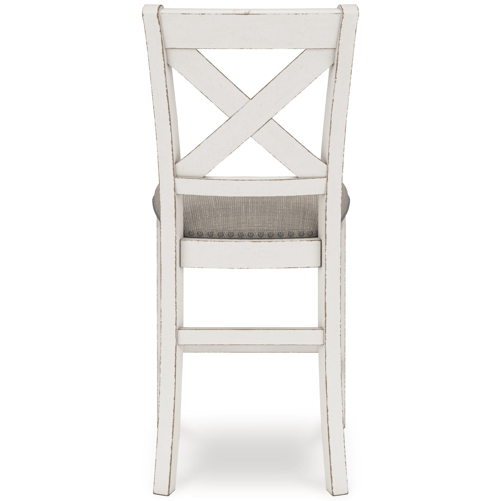 Details D642D7: Includes dining table top and base, Made with rubberwood solids, ash veneer and MDF substrates, Antiqued white finish with wood grain texture, Two 10-bottle wine storage shelves (1 reversible), Lower door cabinet accessible from both sides, 2 pass-through drawer bins, Assembly required, D642-124: Made with wood, Antiqued white finish with wood grain texture, Foam cushion with polyester upholstery, Nailhead trim, X-back, Assembly required,