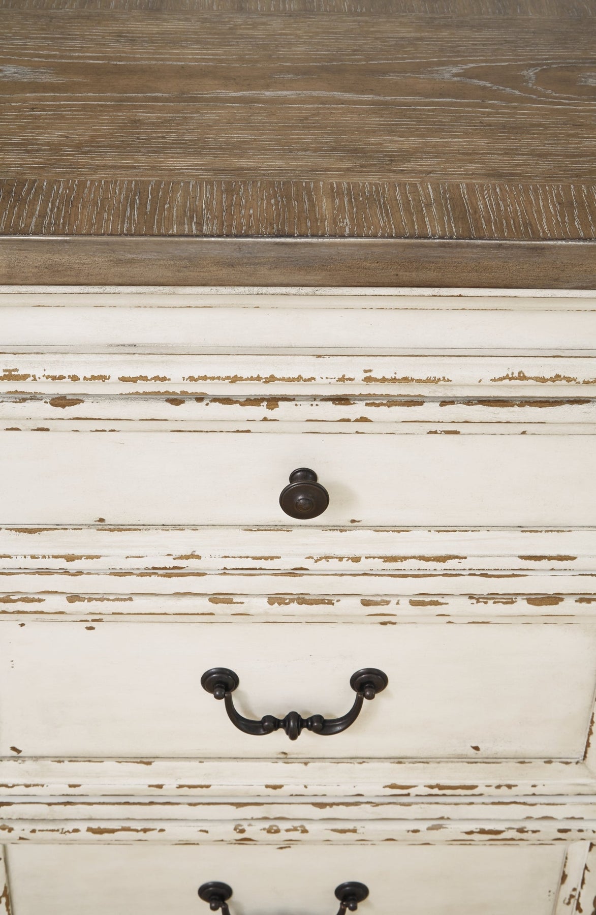 Details D743-45: Made of veneers, wood and engineered wood with some cast resin components, Antiqued two-tone finish, Separate extension leaf, Table extends by pulling both ends and dropping in leaf, Seats up to 8, Assembly required, D743-02: Made with wood and engineered wood, Distressed, chipped white finish, Stylized ribbon back design, Polyester upholstery over foam cushioned seat, Assembly required,