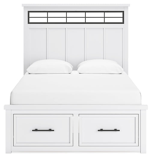 Includes panel headboard, storage footboard, rails and roll slats, Footboard made with hardwood solids, MDF substrates and butcher block oak veneer, Headboard and rails made with hardwood solids and MDF substrates, White finish, Headboard with inset black metal barn sash, 2 drawers in footboard with fully finished interior, dovetail construction and ball-bearing side glides, Pulls with matte black finish, Bed does not require a foundation/box spring, Mattress available, sold separately, Assembly required |