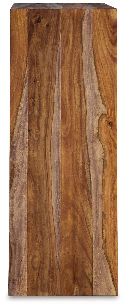 Details Made with sheesham wood, veneer and MDF substrate, Clear natural wood-tone finish, Front frame with thick beveled edge, 5 smooth-gliding drawers with fully finished interior, dovetail construction and heavy duty ball-bearing side glides