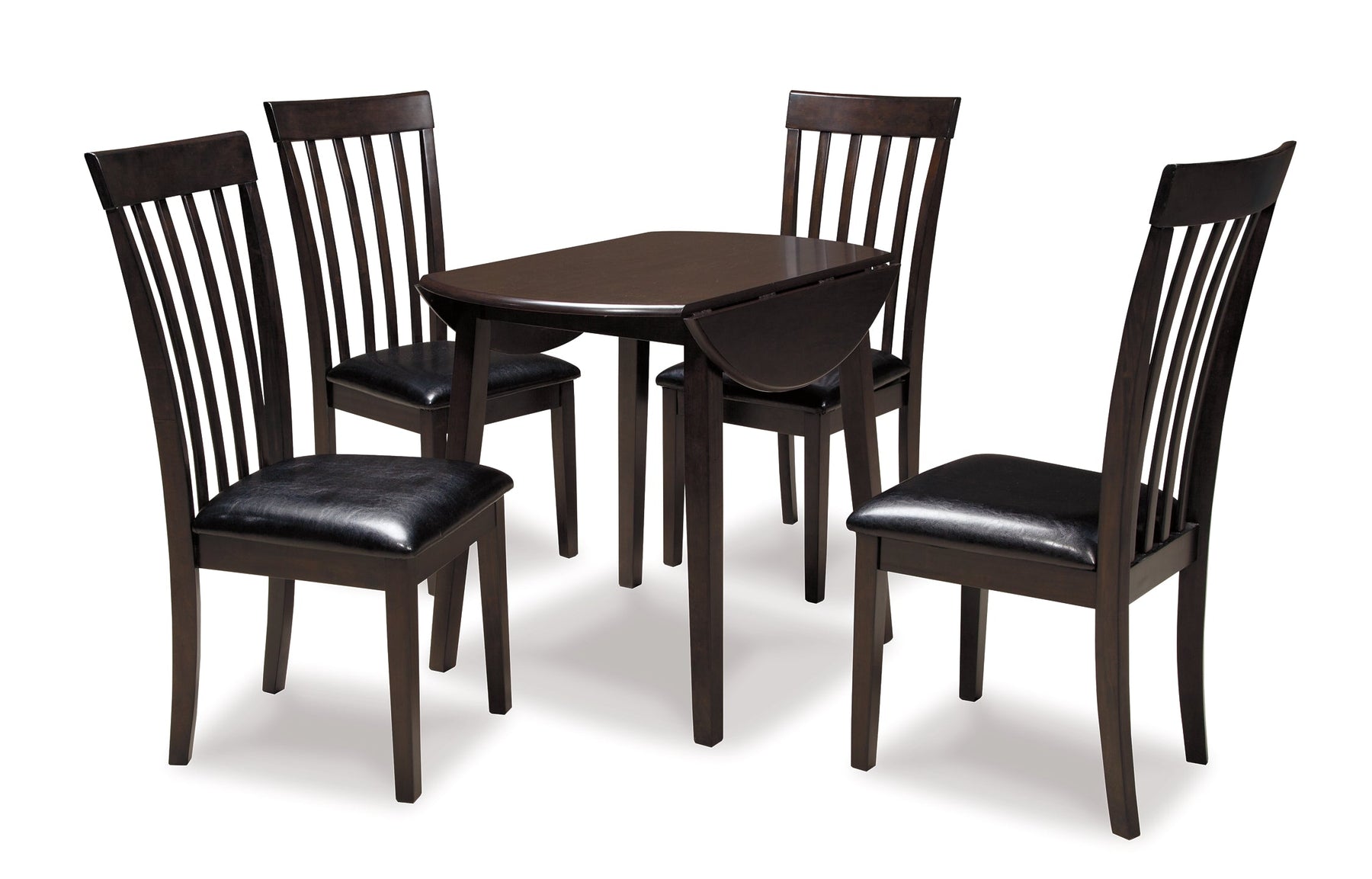 Short on space can still mean you’re long on style. If contemporary decor tantalizes your taste buds, savor the beauty of this 5-piece dining set. Dark and dramatic, this sleek drop leaf dining table and rake-back dining chairs pack plenty of appeal into a compact design.