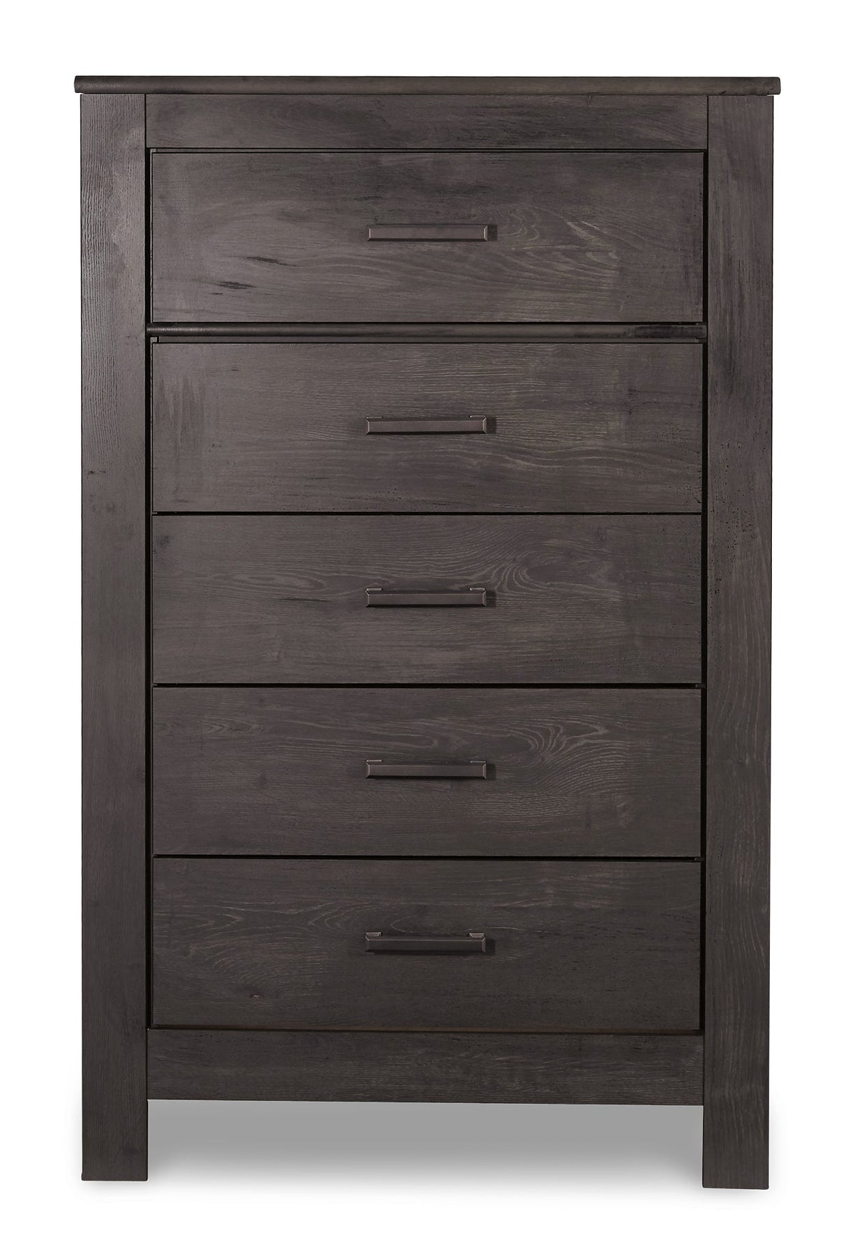 Priced to entice and styled to impress, this 5-piece bedroom set is urban sophistication with a decidedly relaxed air. It’s got the crisp, clean lines of a contemporary piece, but with an earthy element. Deep, horizontal grooves infuse depth and dimension, while a replicated oak grain effect gives the charcoal gray finish warmth and character.