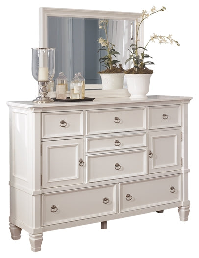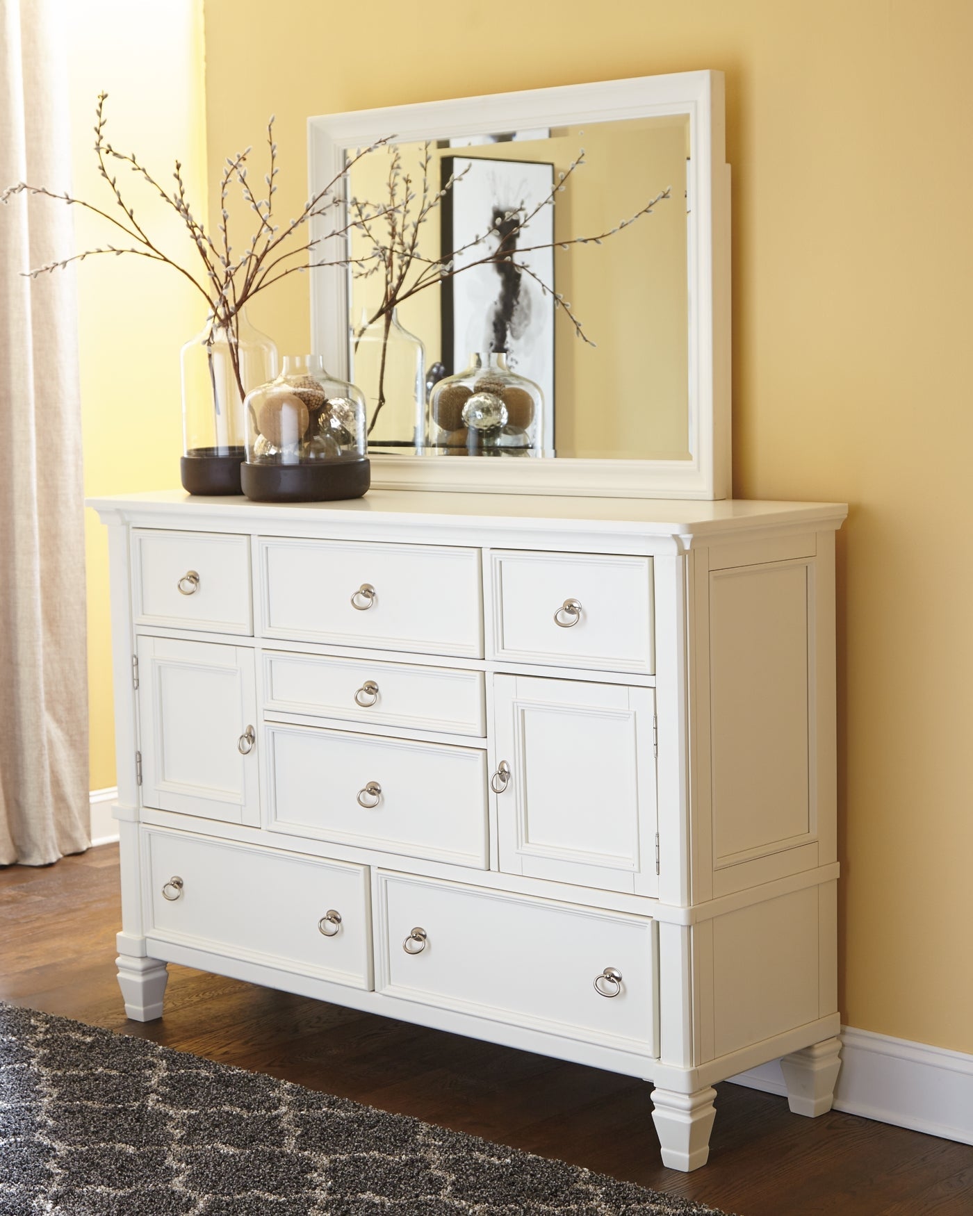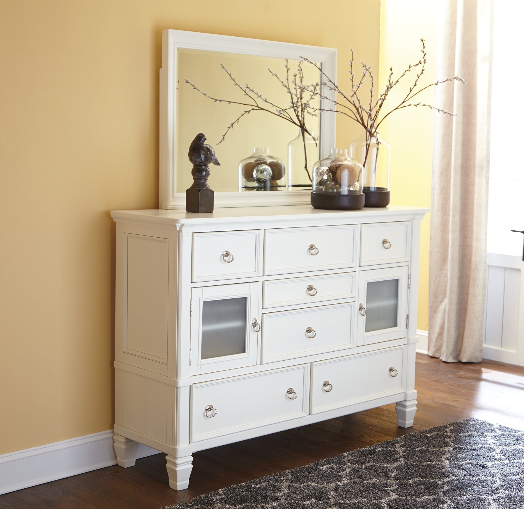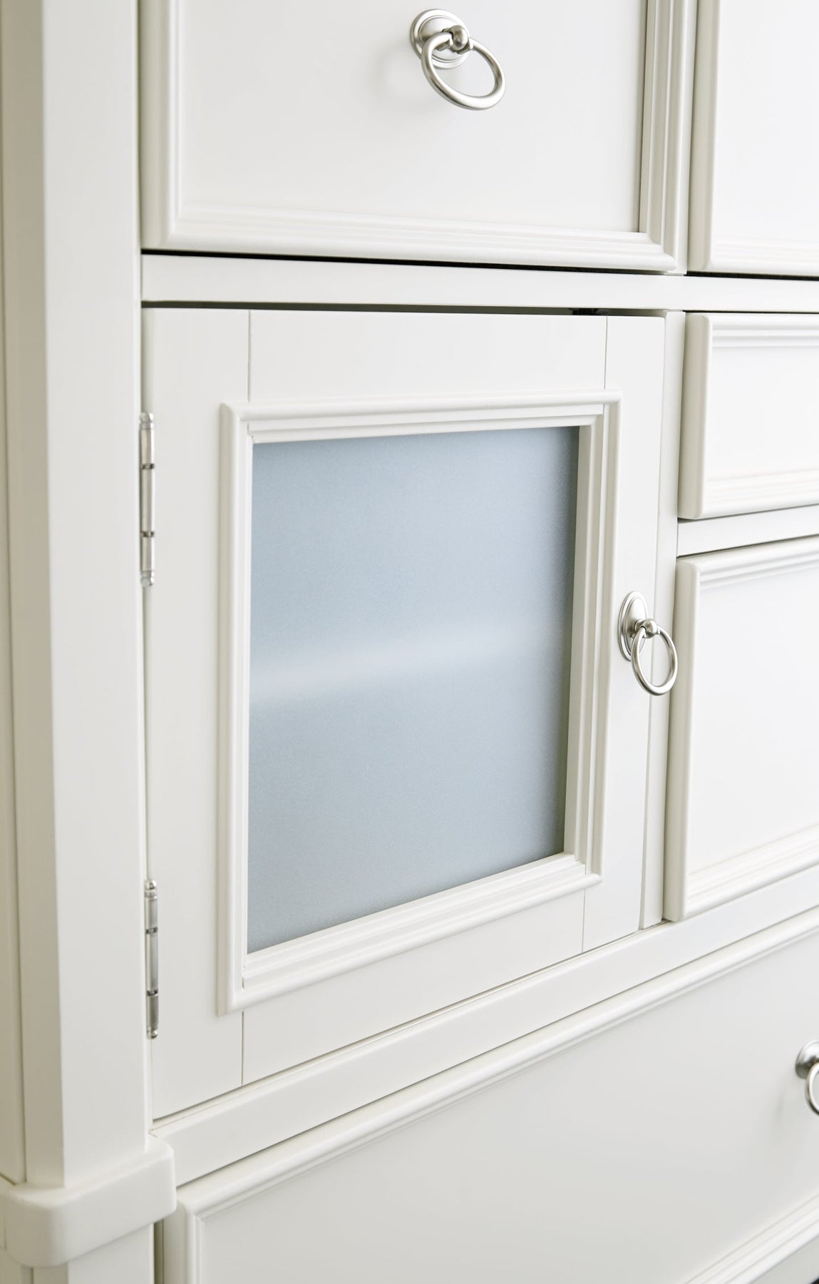Details | Made of veneers, wood and engineered wood, Satin nickel-tone hardware, 7 smooth-operating drawers with dovetail construction, Top drawers with felt bottoms, 2 cabinets with 2 shelves; 1 adjustable, Cabinet doors with optional frosted glass inserts, Mirror attaches to back of dresser, Assembly required, Includes tipover restraint device | |