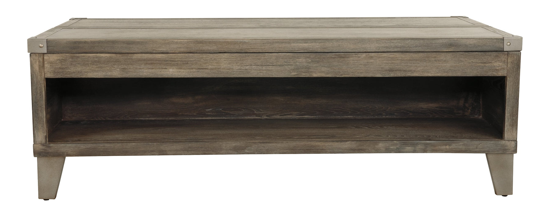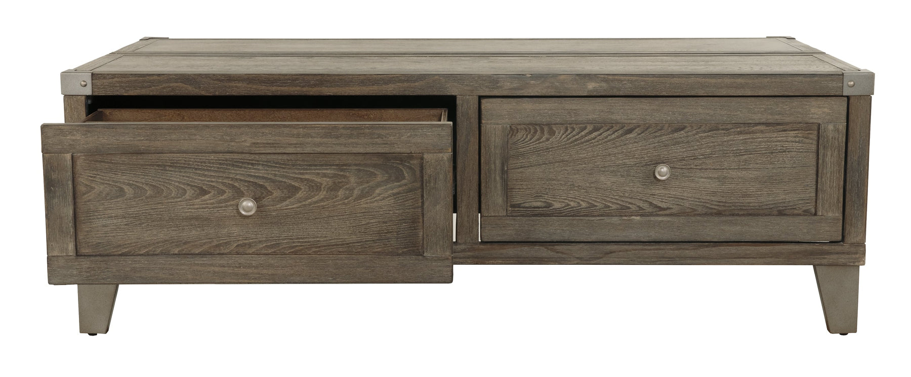 Details | Made of elm veneers, solid pine, engineered wood and metal, Weathered finish, Split top design (with spring lift on one side), 2 smooth-gliding drawers, Silvertone metal hardware and feet, Assembly required | |