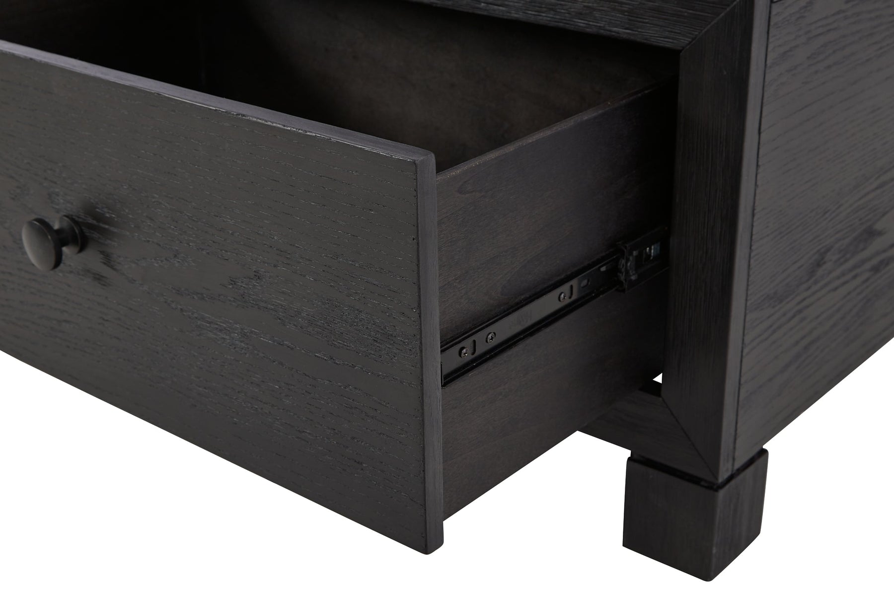 Details | Made with wood, oak veneer and engineered wood, Black finish with wire-brushed effect to enhance wood grain, Metal knobs with black finish, 4 soft-close, smooth-gliding drawers with dovetail construction, Assembly required | |