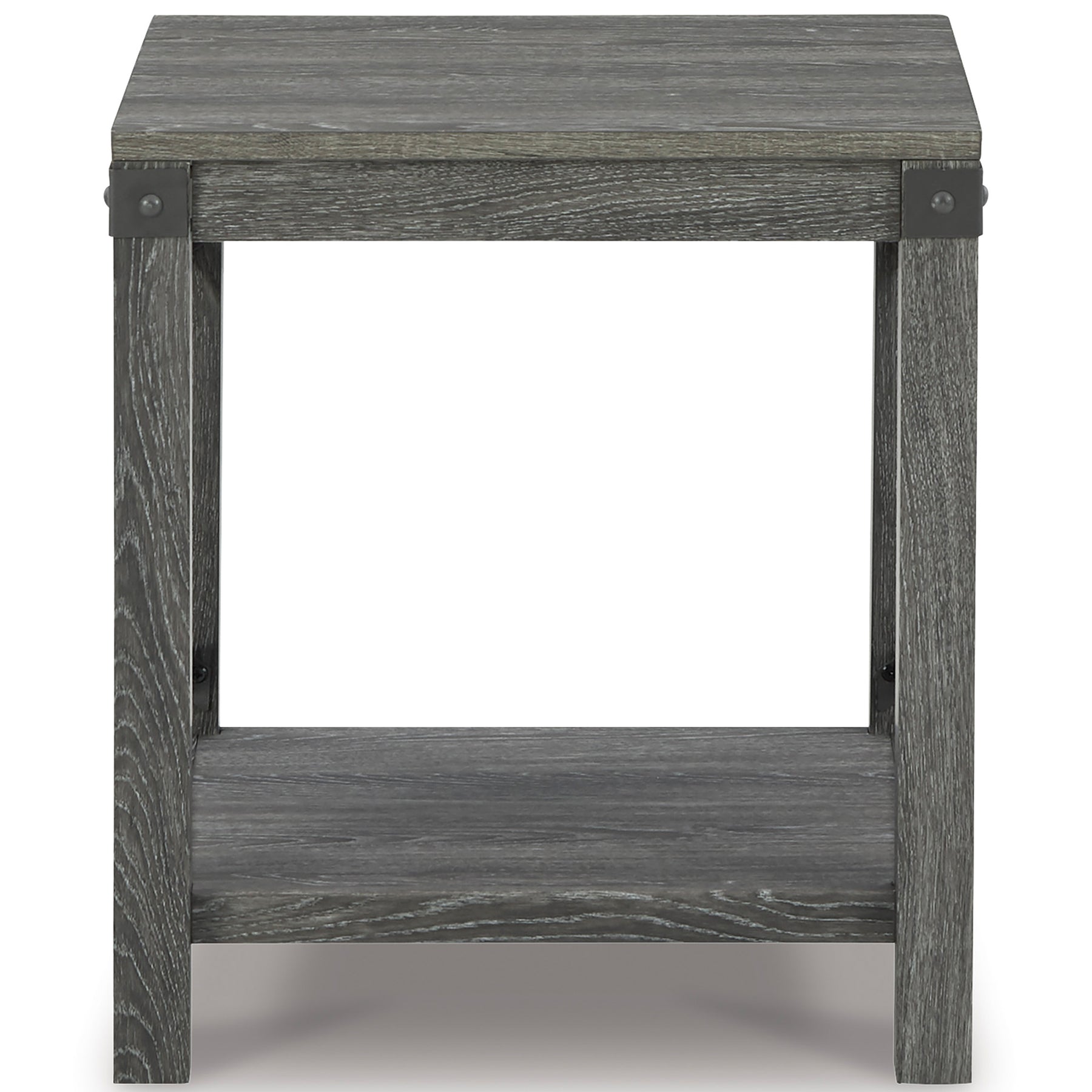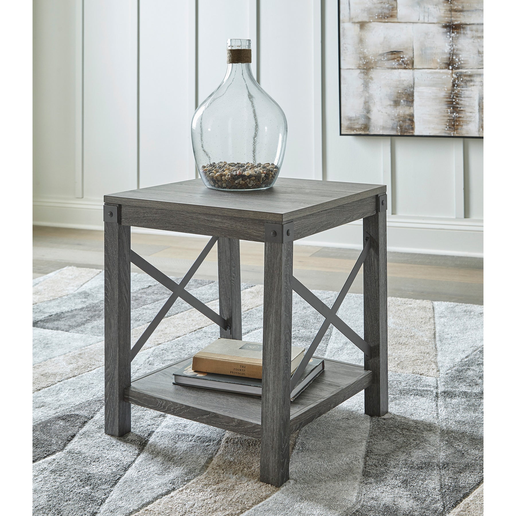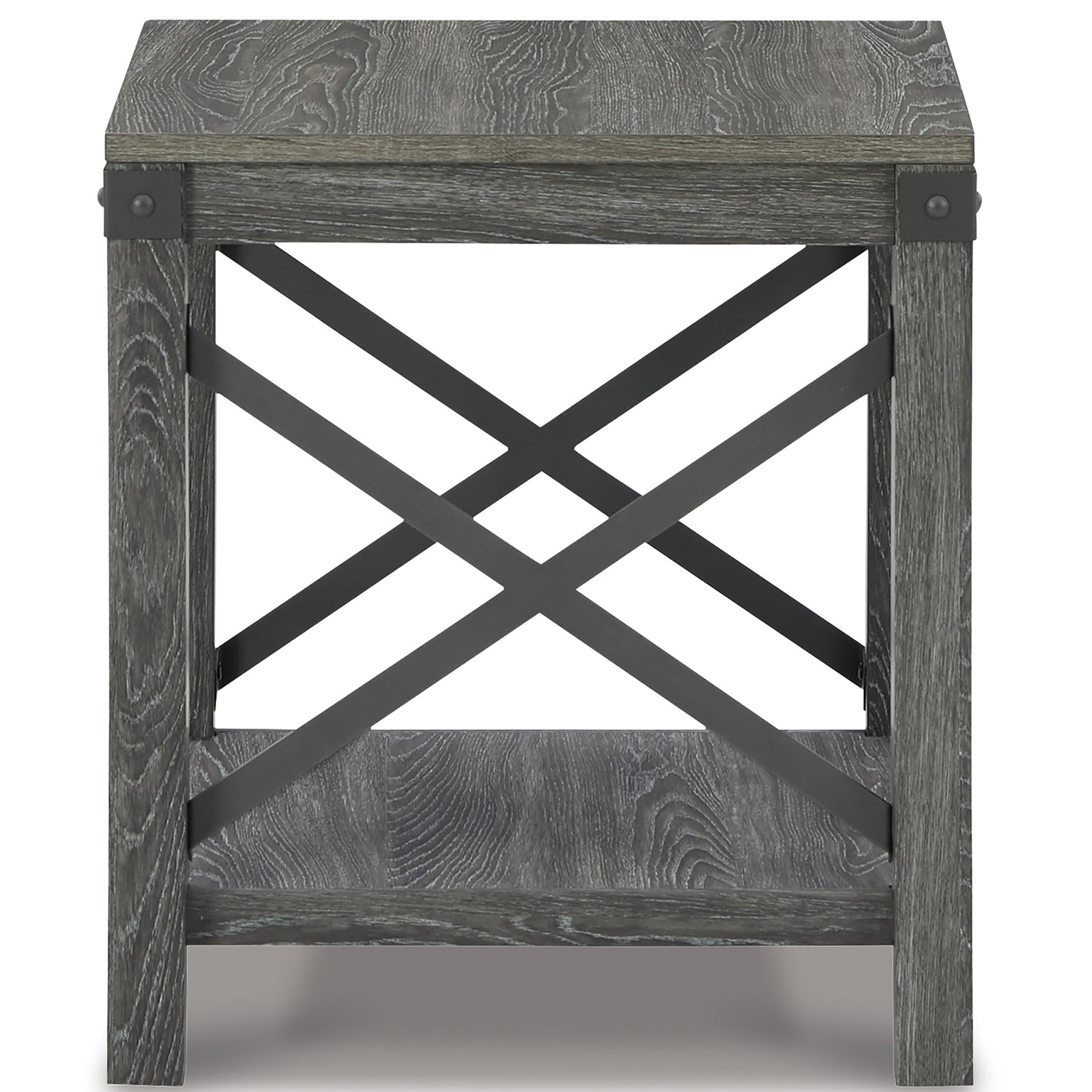 Open the door to modern farmhouse style with this square end table. The beautiful woodgrain look and classic crossbuck metal accents are a cool touch, while the lower shelf provides surface space for fashionable home accessories.
