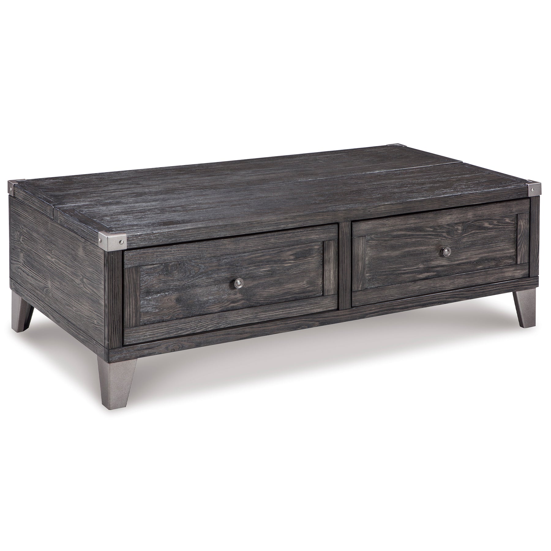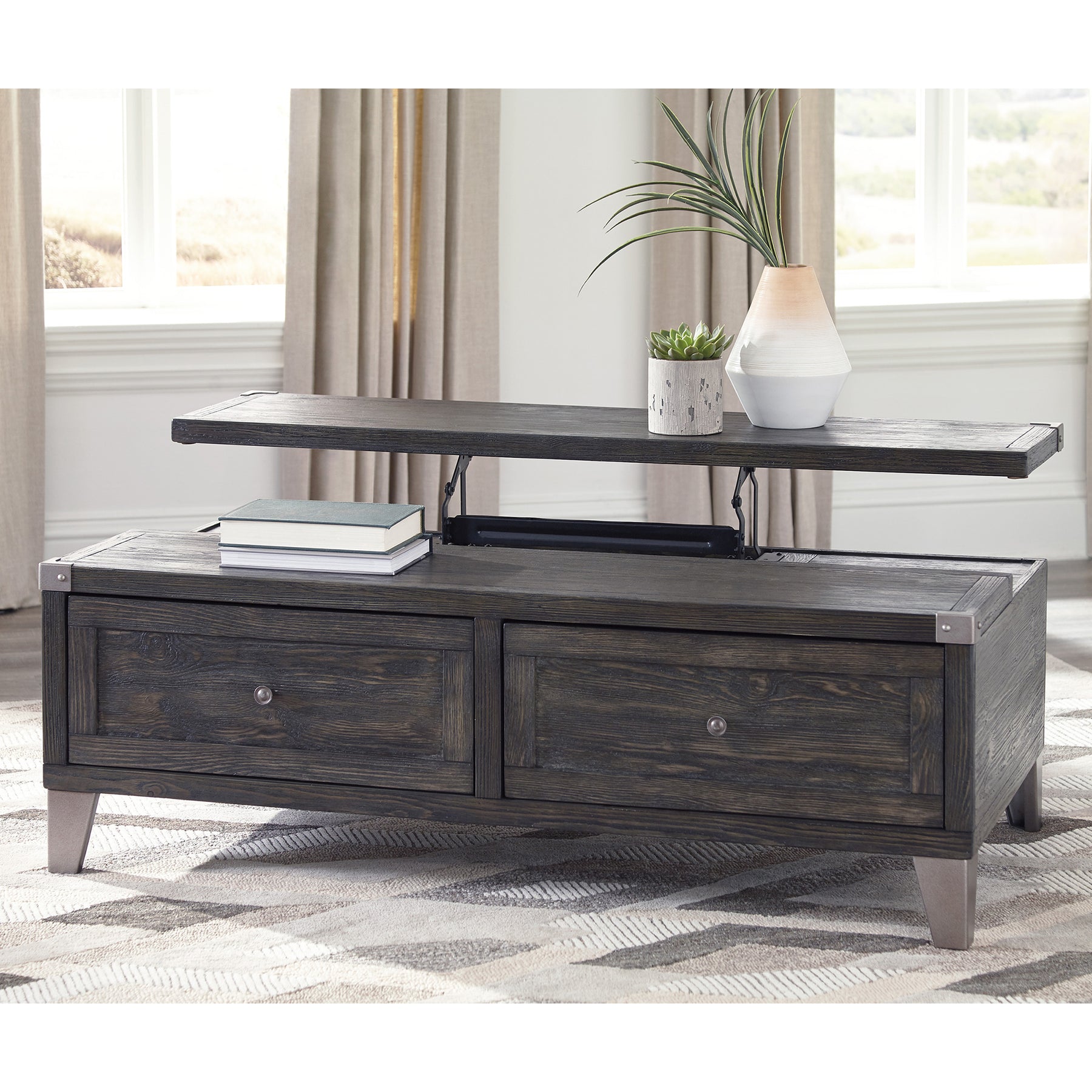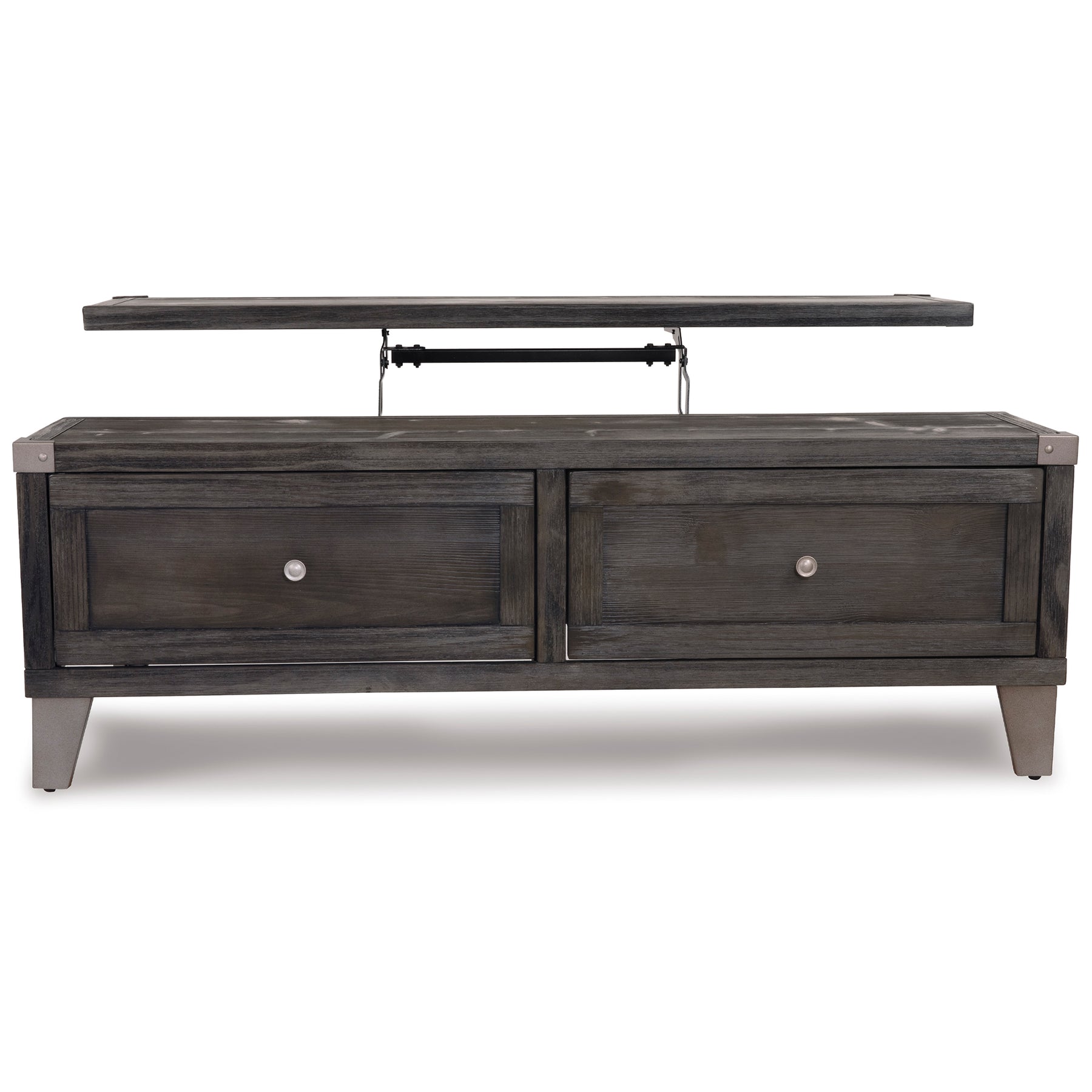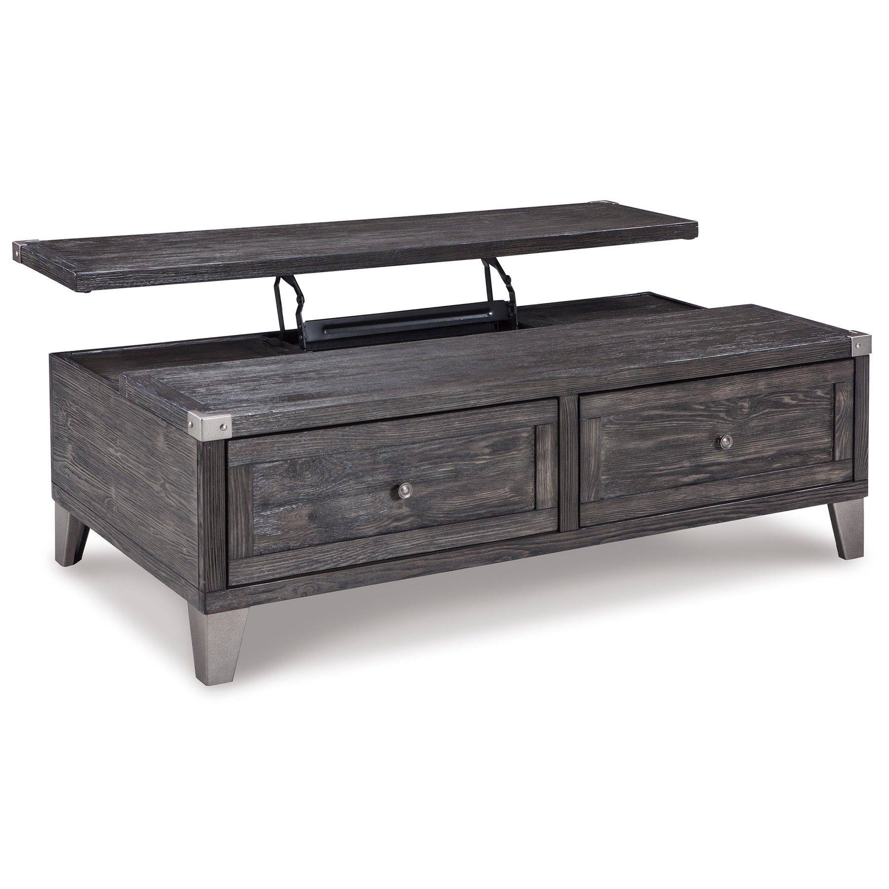 Mixed material lift top table truly elevates rustic-industrial style. Weather-washed pine wood and veneers are contrasted with canted metal legs and corner bracket accents for a uniquely chic merger of earthy beauty and contemporary flair. A handy spring-loaded mechanism brings the tabletop to you, while two drawers with removable storage trays are packed with possibilities.