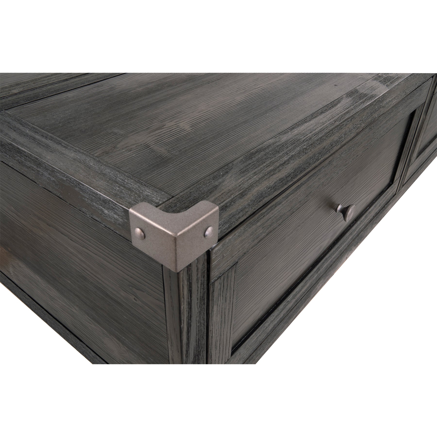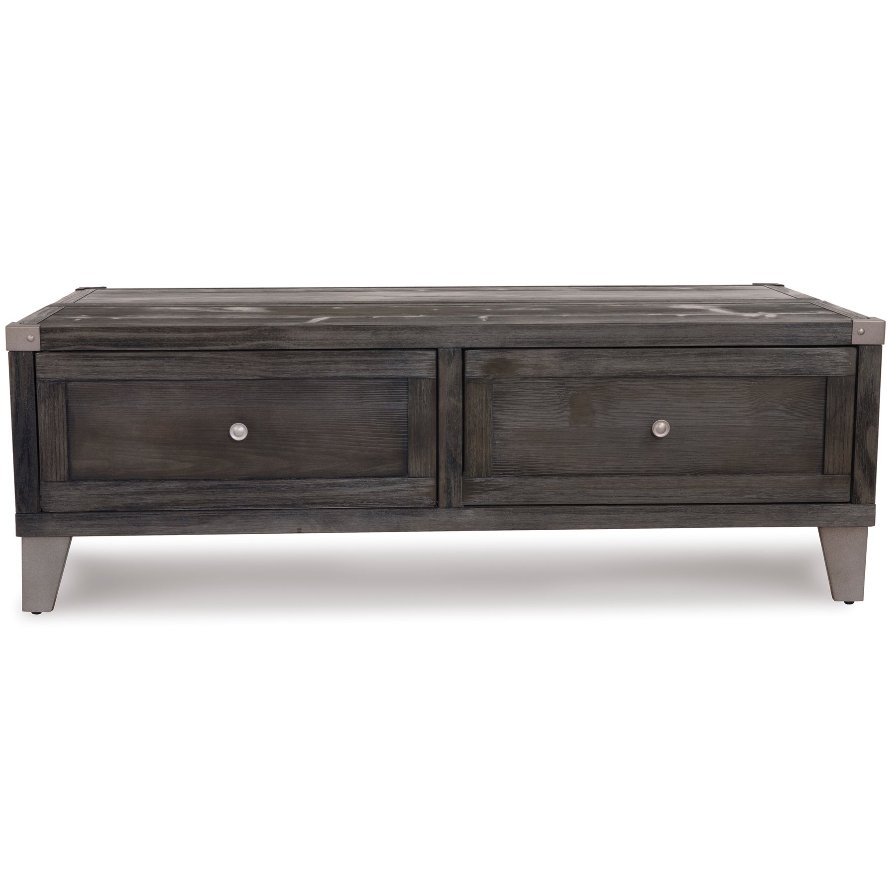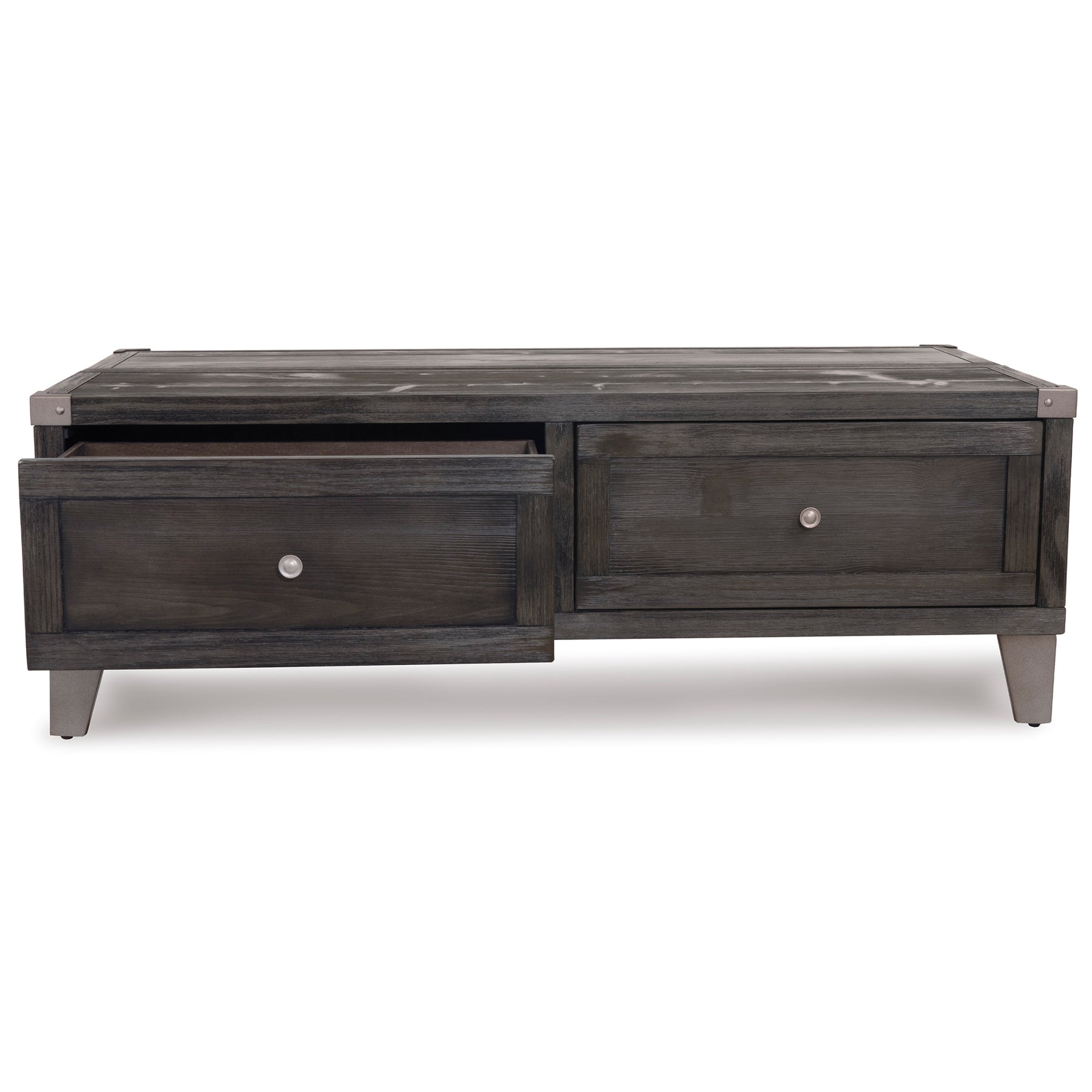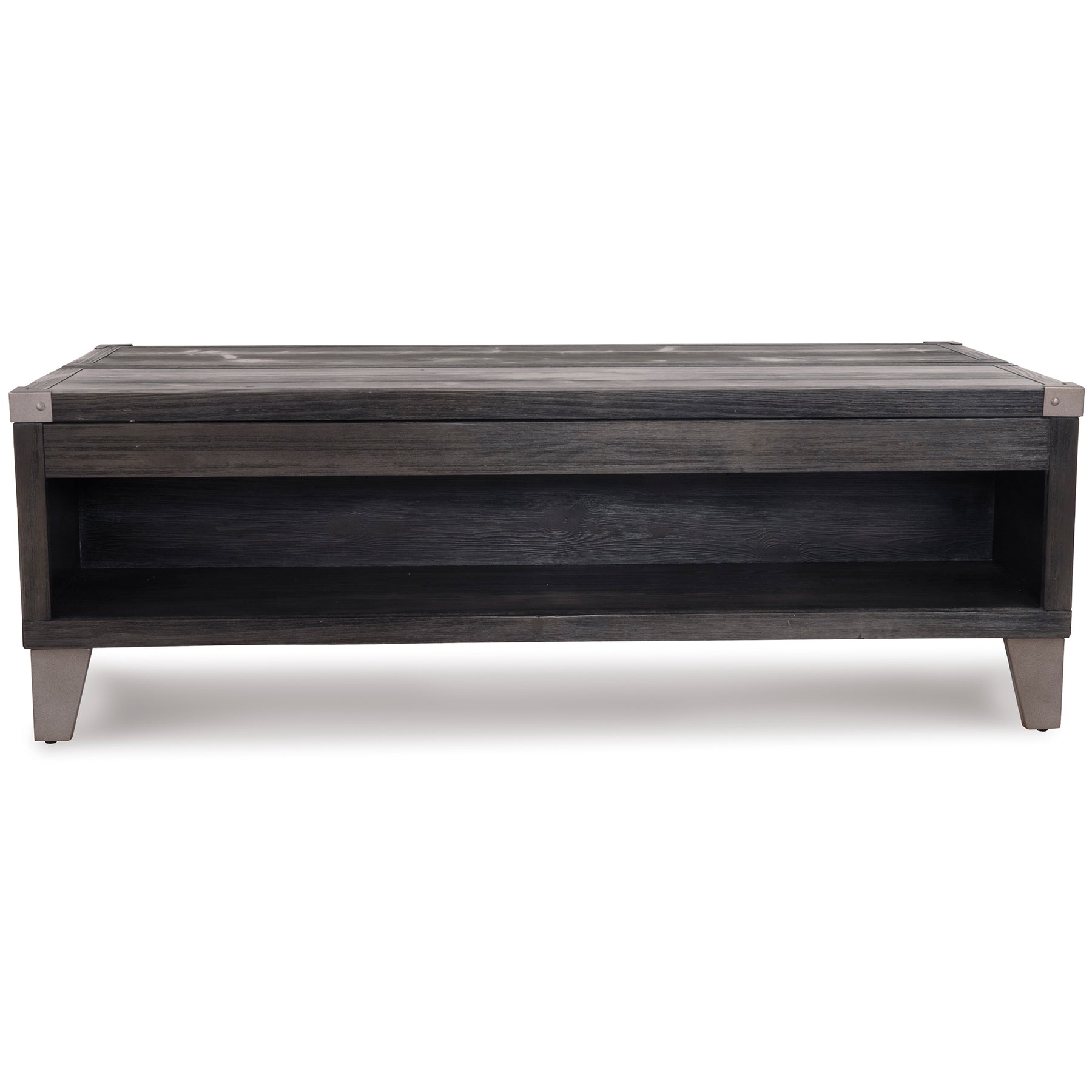 Mixed material lift top table truly elevates rustic-industrial style. Weather-washed pine wood and veneers are contrasted with canted metal legs and corner bracket accents for a uniquely chic merger of earthy beauty and contemporary flair. A handy spring-loaded mechanism brings the tabletop to you, while two drawers with removable storage trays are packed with possibilities.
