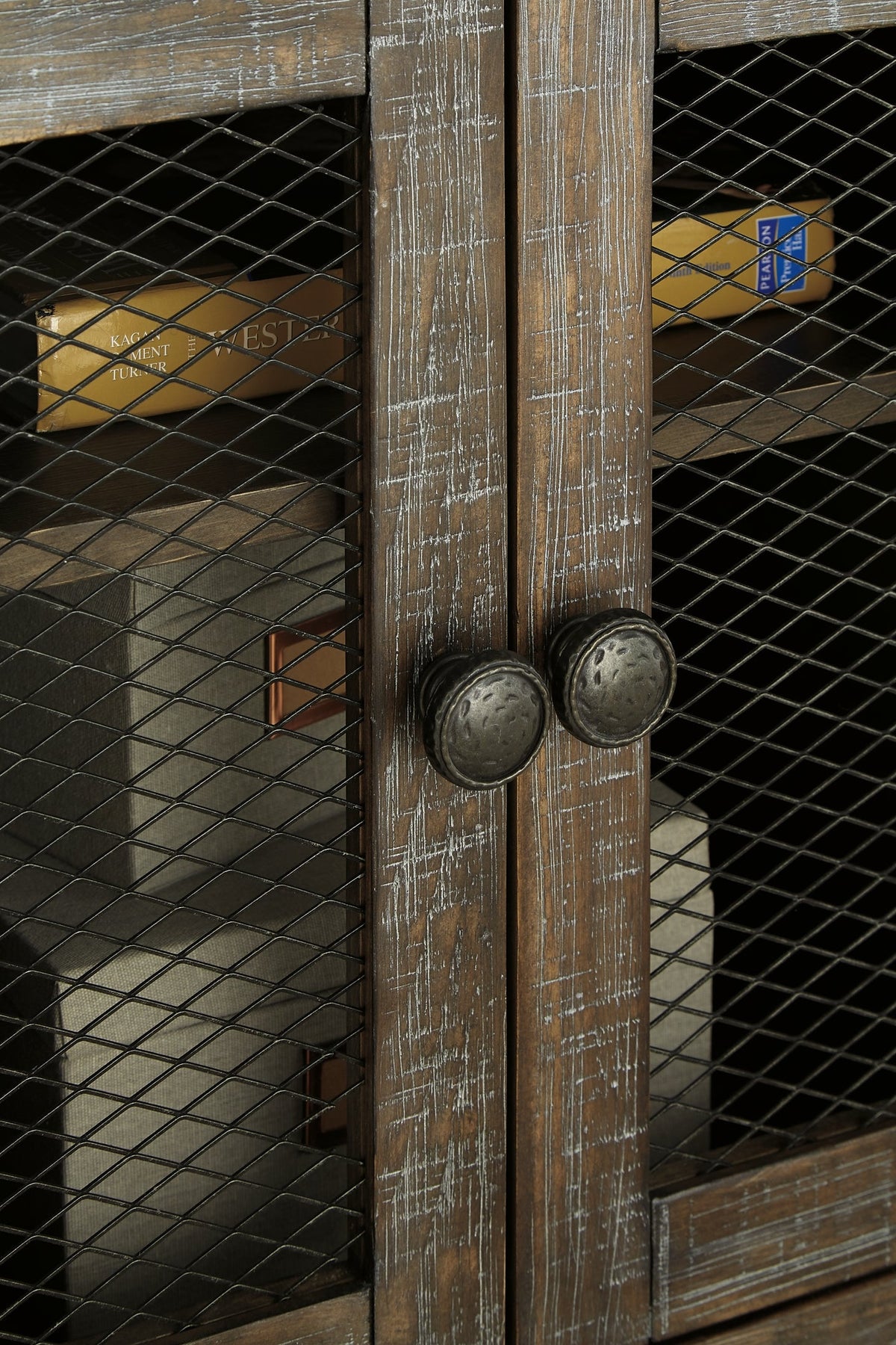 Details | Includes coffee table and end table, Made of veneers, pine wood and engineered wood, Distressed finish with light wire-brushed texture, Dark iron-tone brackets/hardware, Coffee table with shelf with wire mesh details, End table with double doors with inset wire mesh revealing single-shelf storage, Assembly required | |