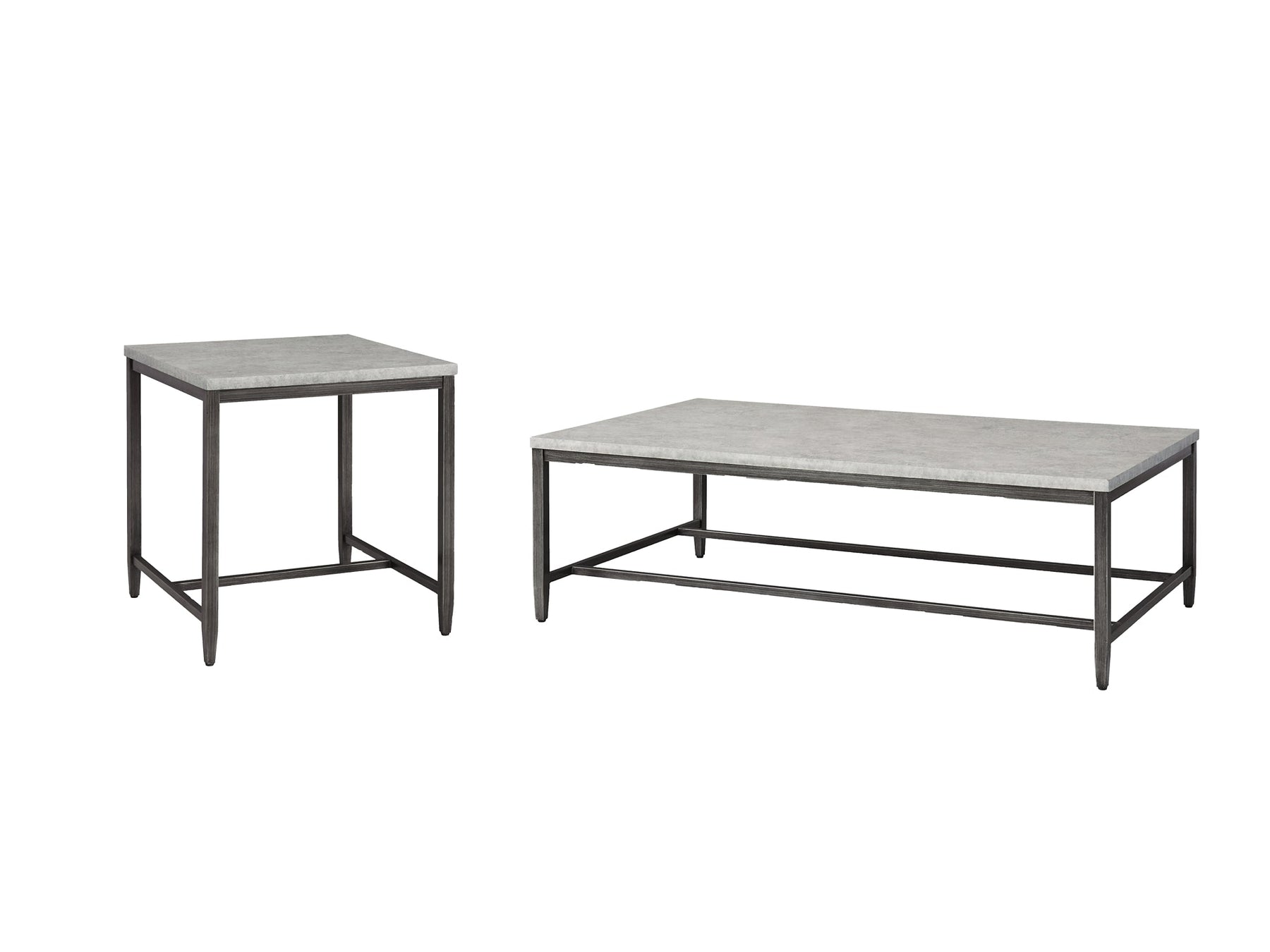Details | Includes coffee table and end table, Faux concrete melamine top, Metal base in dark pewter-tone finish, Assembly required | |