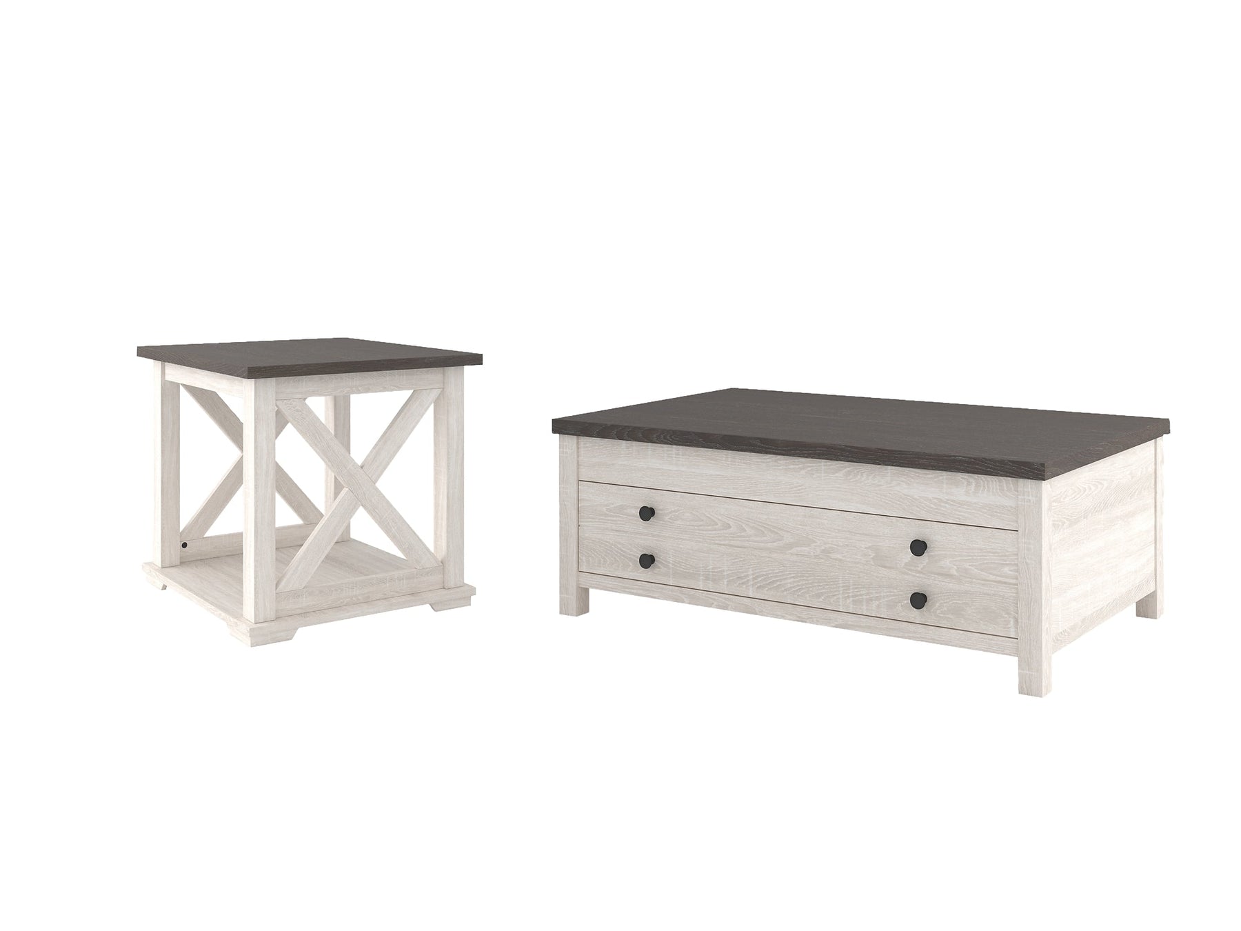 Details | Includes rectangular coffee table and square end table , Made of decorative laminate over engineered wood with two-tone, gray and antiqued white color scheme, Coffee table with lift-top design, Assembly required | |