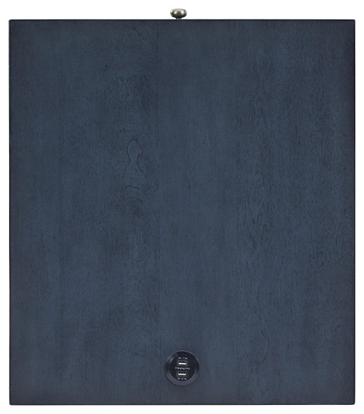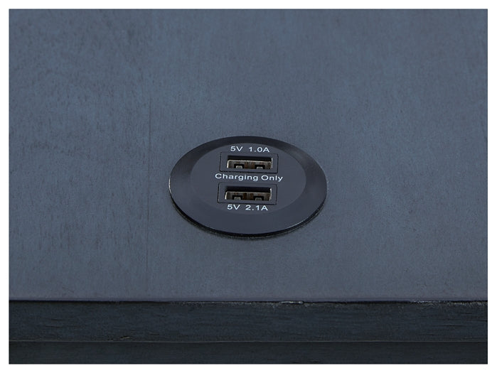 Details Made of veneer, solid and engineered woods, Antiqued gray finish, Pewter-tone hardware, 1 drawer, 2 USB charging ports, Assembly required