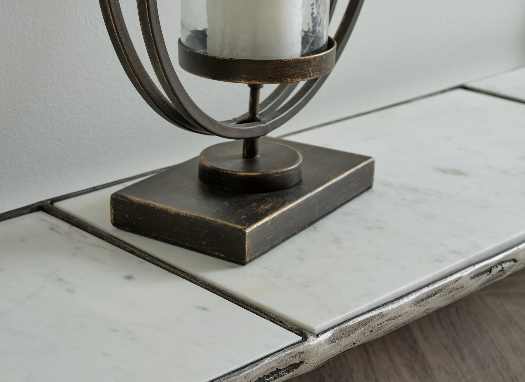 | Details | Made with sand casted aluminum, Antiqued brass-tone finish, Clear glass tabletop, White marble lower shelf, Assembly required | |