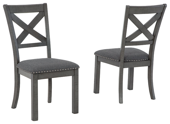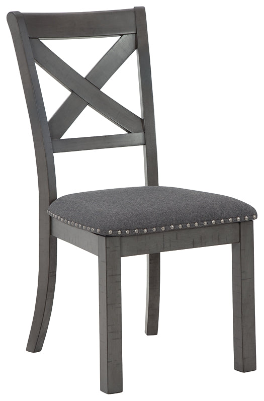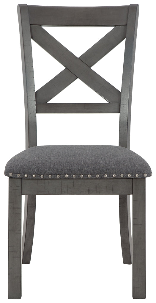 Going gray in the best possible way. This upholstered dining chair wows with an utterly on-trend smoky gray finish and X-back styling. Its softly cushioned seat with gray textured upholstery and nailhead trim will have you lingering a little longer at mealtime. Just a touch of distressing helps it fit right in with your modern farmhouse decor.