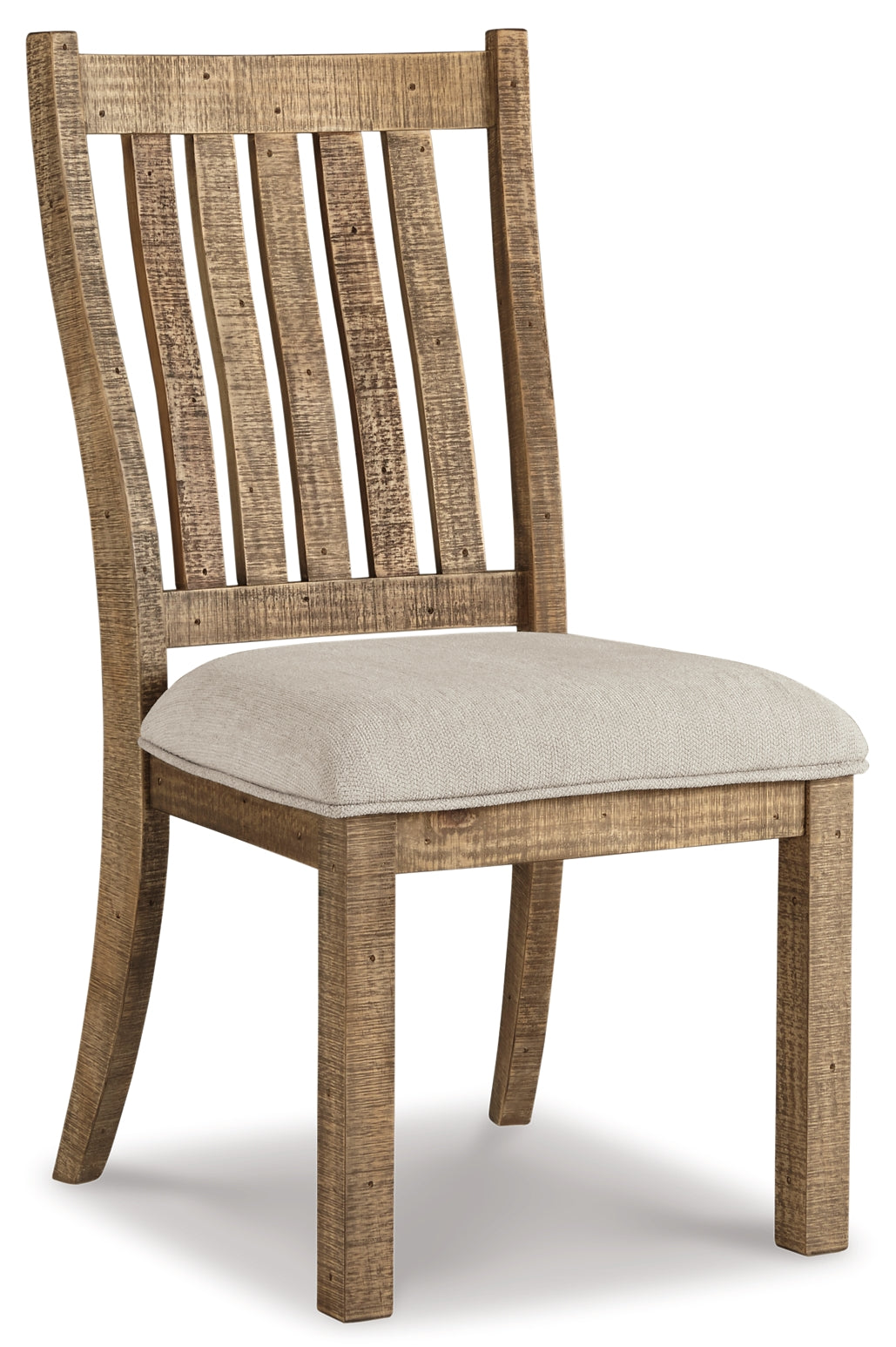 Details | Includes dining table and 6 chairs, Light brown finish; assembly required, Table seats up to 6, Table made of reclaimed wood, wood and engineered wood, Side chair made of wood, Slat back design, Easy-clean polyester (Nuvella®) upholstered foam cushioned seat remains vibrant and resists stains | |