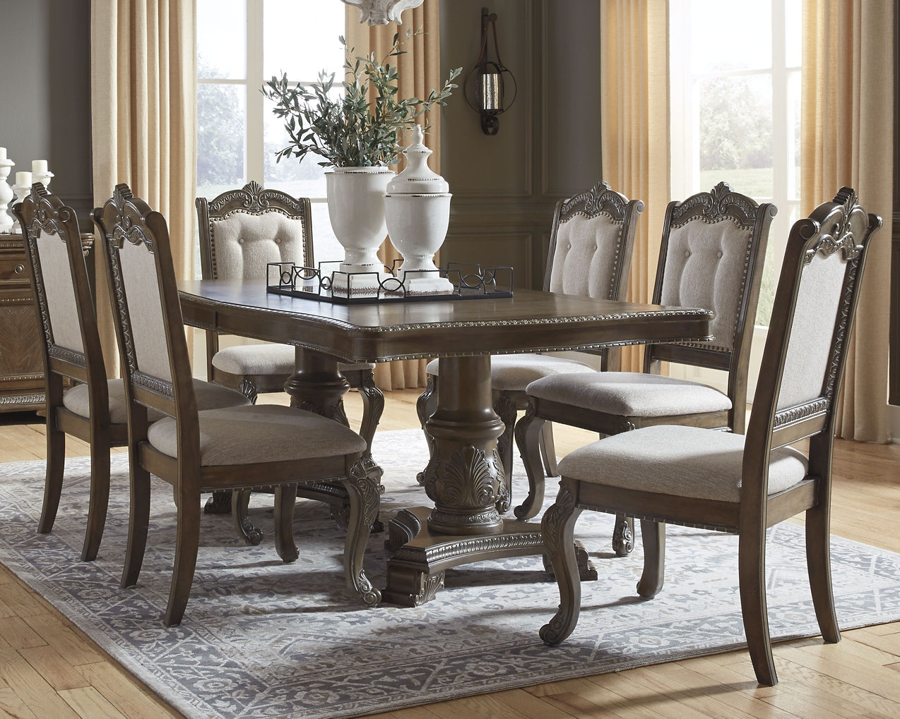 Details | Includes extension dining table and 6 upholstered dining side chairs, Dark brown finish with glazed white highlights, Table made of veneer, wood and engineered wood with cast resin elements, Table with separate extension leaf extends by pulling both ends and dropping in leaf, Table seats up to 8, Chairs made of wood with cast resin accents, Chairs with cushioned seat and back with polyester upholstery, Chairs with button-tufted back cushion with bronze-tone nailhead accents, Assembly required | |