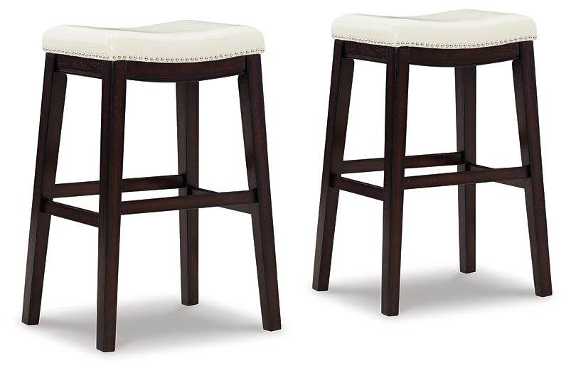 Taking a timeless approach to casual stylings, this set of 2 bar height bar stools is a charming addition to your dining room or kitchenette. Ivory faux leather on the cushioned saddle seat keeps things comfortably chic, while nailhead trim invites a subtle touch of traditional glamour.