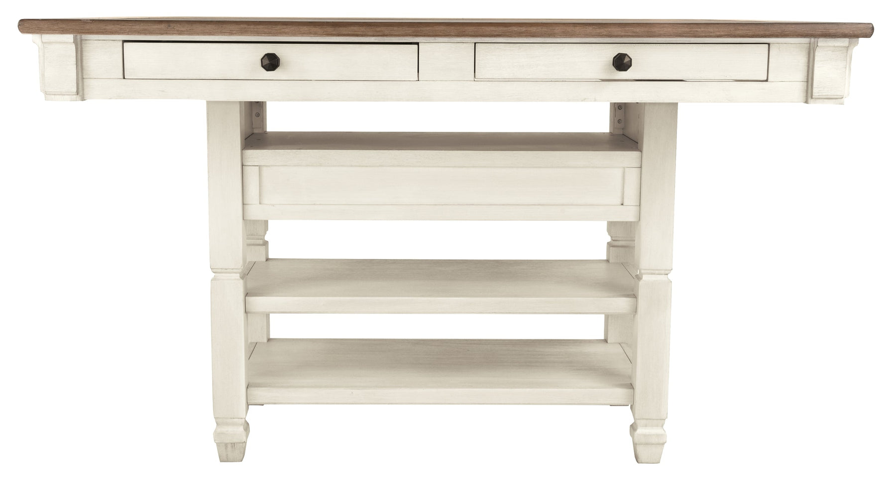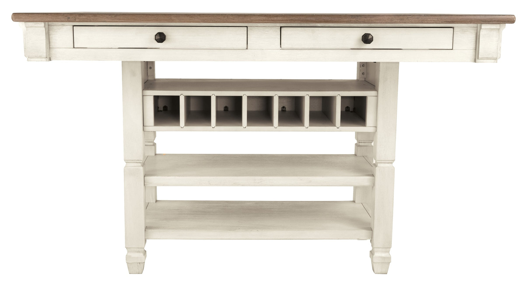 Details Made of veneers, wood and engineered wood, Two-tone textural finish; antique white with weathered oak finished top, 4 drawers; 2 each on each side, Storage rack holds up to 7 wine bottles, Seats up to 6, Assembly required