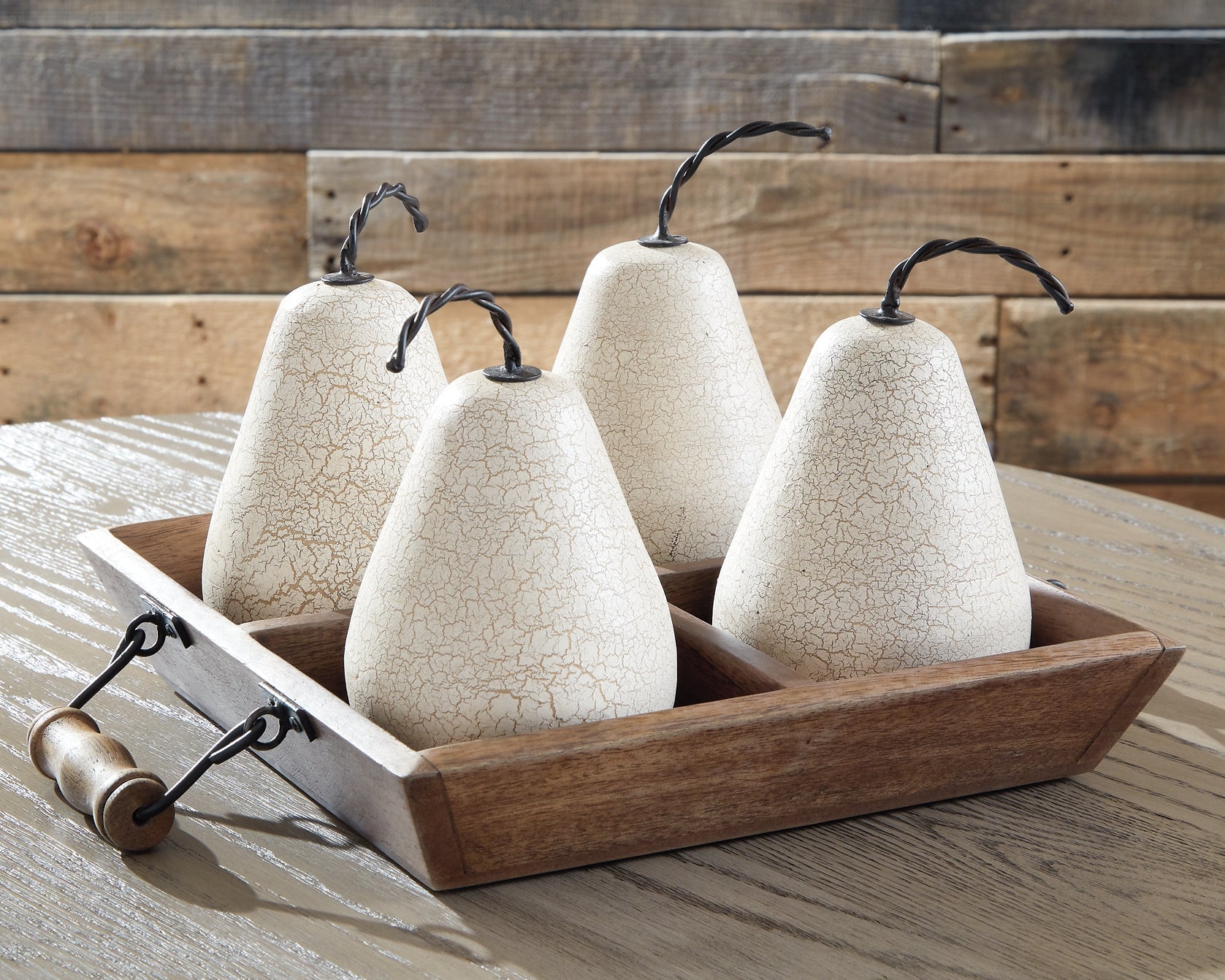Details | Made of metal, wood and composite material, 5-piece set includes 4 fruits and 1 wood tray | |