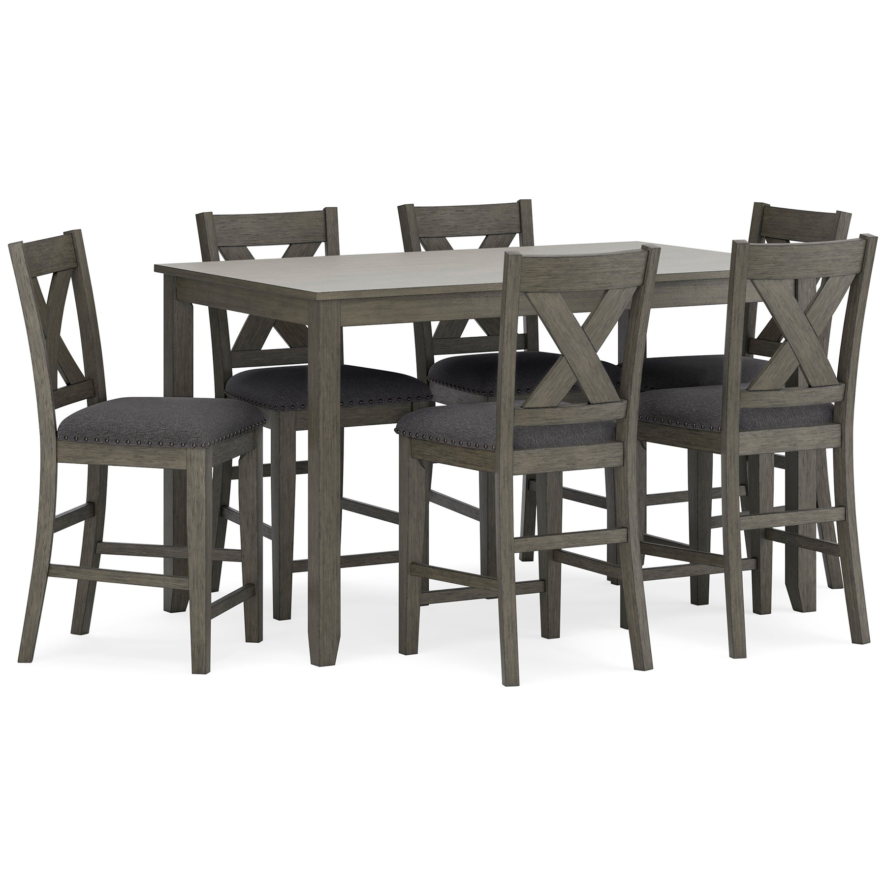 Details | Includes counter height dining table and 6 counter height bar stools, Table made with hardwood solids, acacia veneer and MDF substrate, Stools made with solid hardwood frames, Antiqued gray wash finish, Polyester upholstery, Foam cushioned seats, Nailhead accents, Assembly required | |