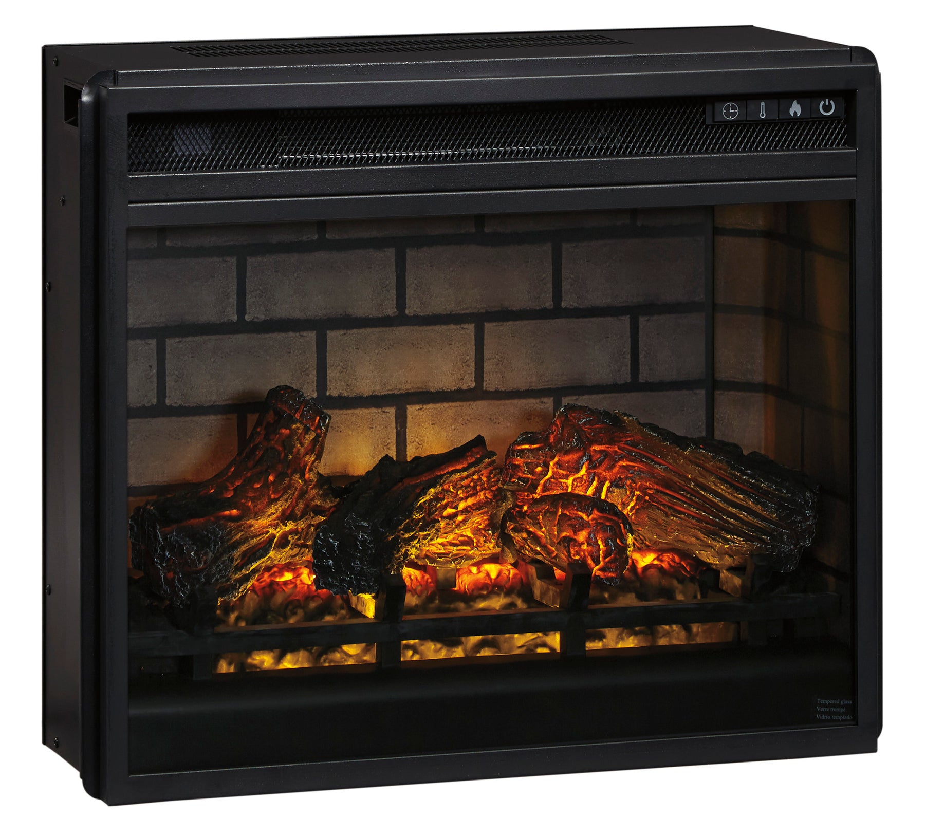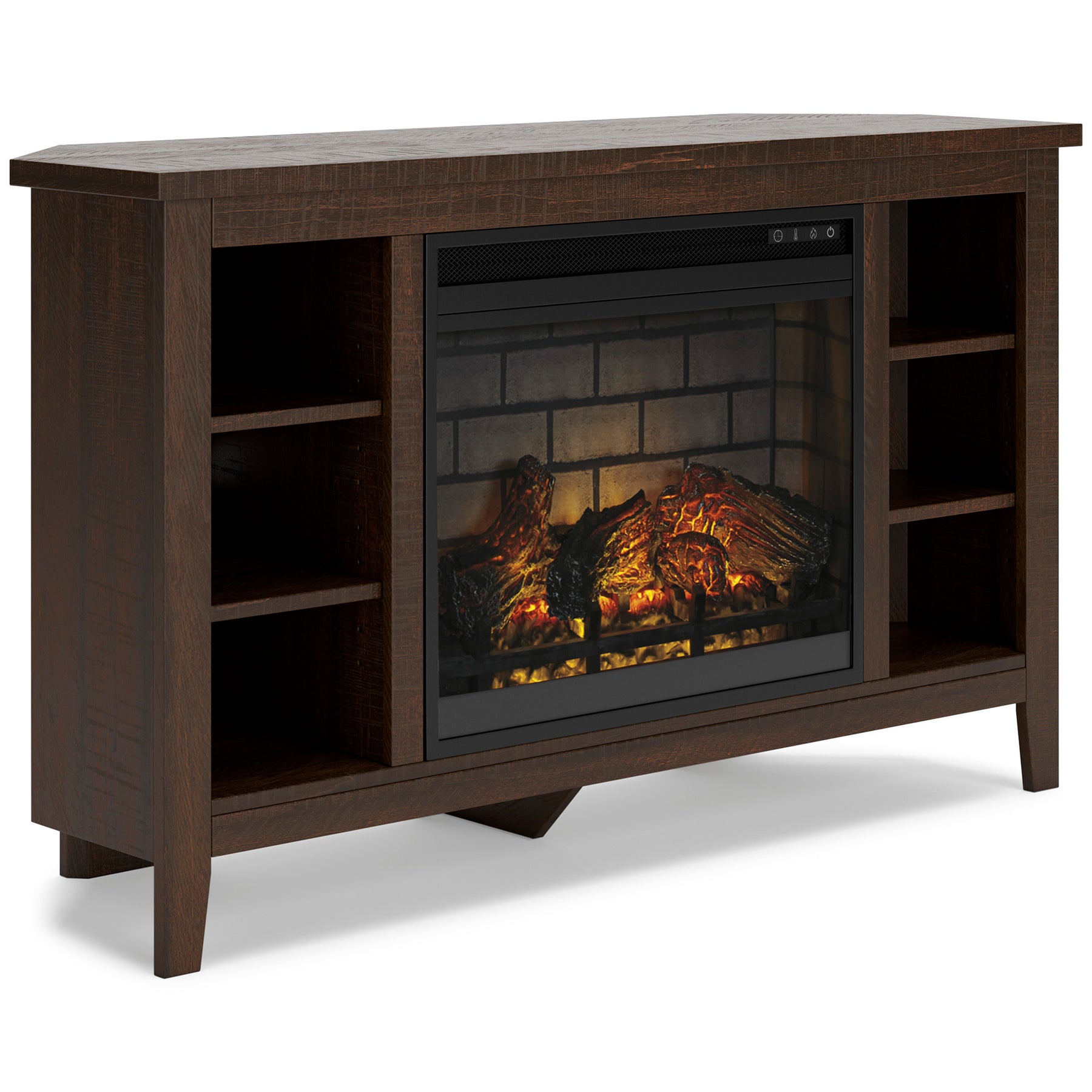 With its replicated burnt umber rustic wood grain and minimalist charm, this corner TV stand is right in tune with your relaxed approach to high style. Beautifully shaped to nestle into any corner, it’s well equipped with a flexible open-concept design and cutouts for wire management that enhance the clean-lined aesthetic. What really turns up the heat: an electric fireplace insert with faux firebrick surround that operates with or without infrared heat. The fireplace includes a multi-flame feature, 7-level temperature setting, five brightness levels and an LED glowing embers effect.