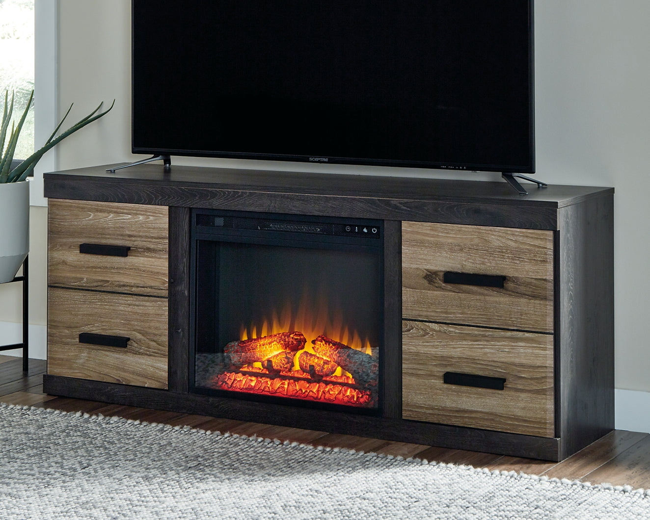 | Details | Includes TV stand and electric fireplace insert (W100-101), Made with engineered wood (PDF/particleboard) and decorative laminate, Warm gray vintage finish with a white wax effect; vintage aged black/brown finish over replicated oak grain, Matte black hardware, TV stand with removable center shelf and 2 cabinets, each with single-shelf storage, Cutouts for wire management and venting for heat, Fireplace provides up to 5386 BTU/1500W and warms up to 1,000 square feet (heats larger rooms), 7-level temperature setting, multi flame system, 5 brightness levels and LED glowing embers effect, LED flame operates with or without infrared heat, Remote control with LED display, Programmable timer will turn off the unit after a set period of time, UL Listed; power cord included, Assembly required | |