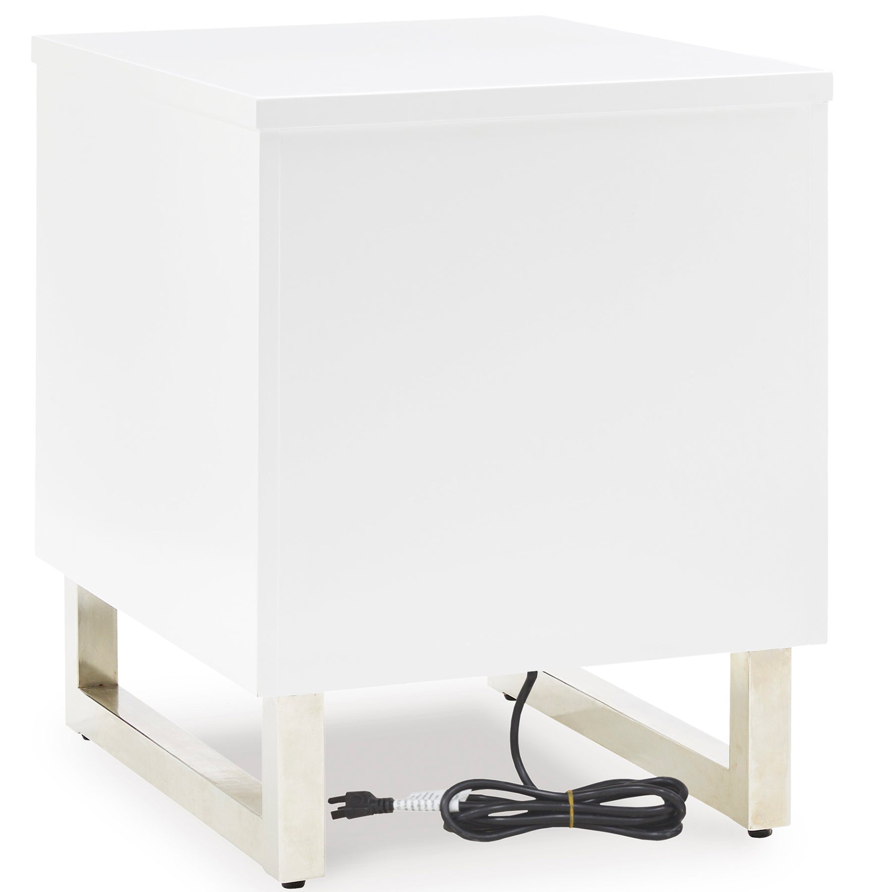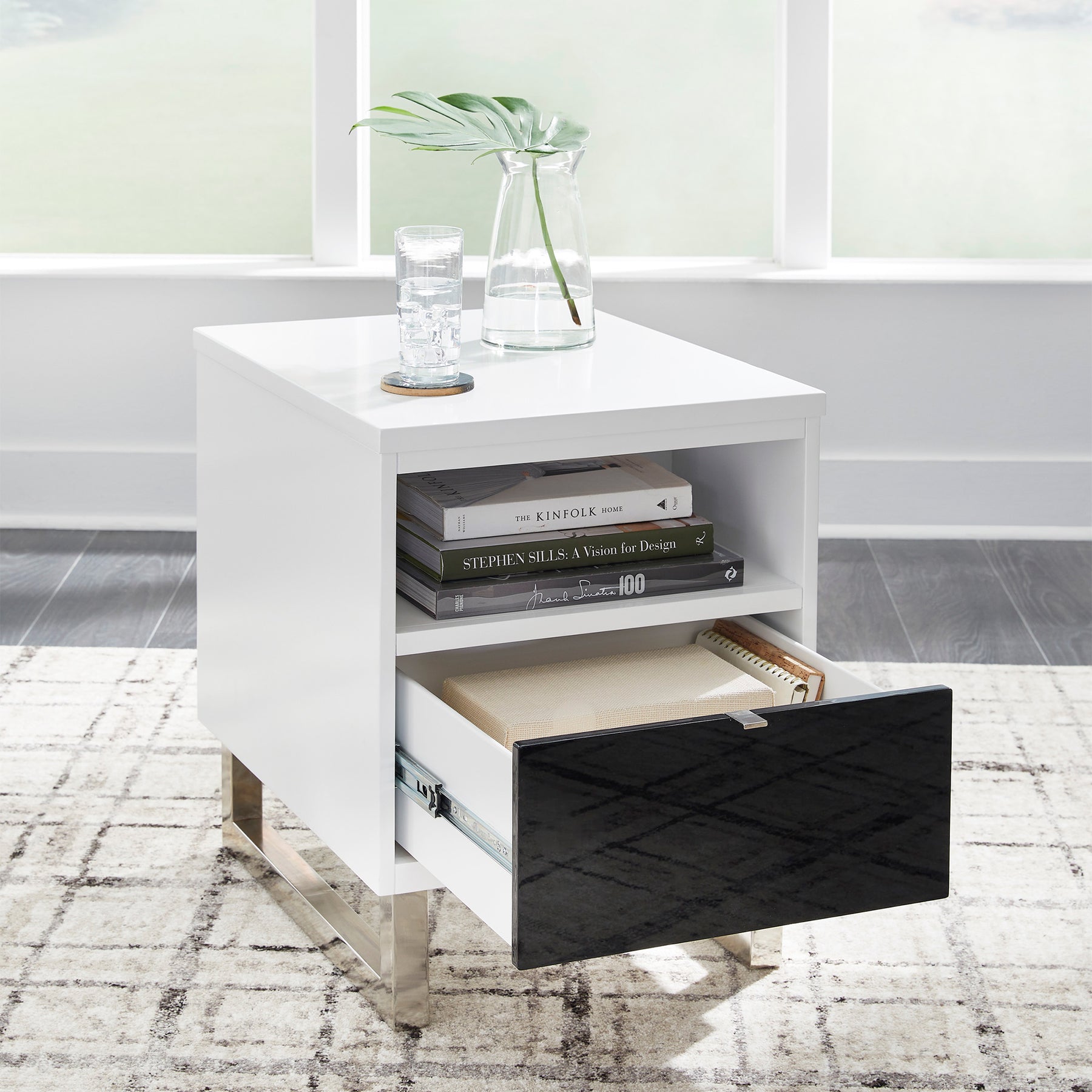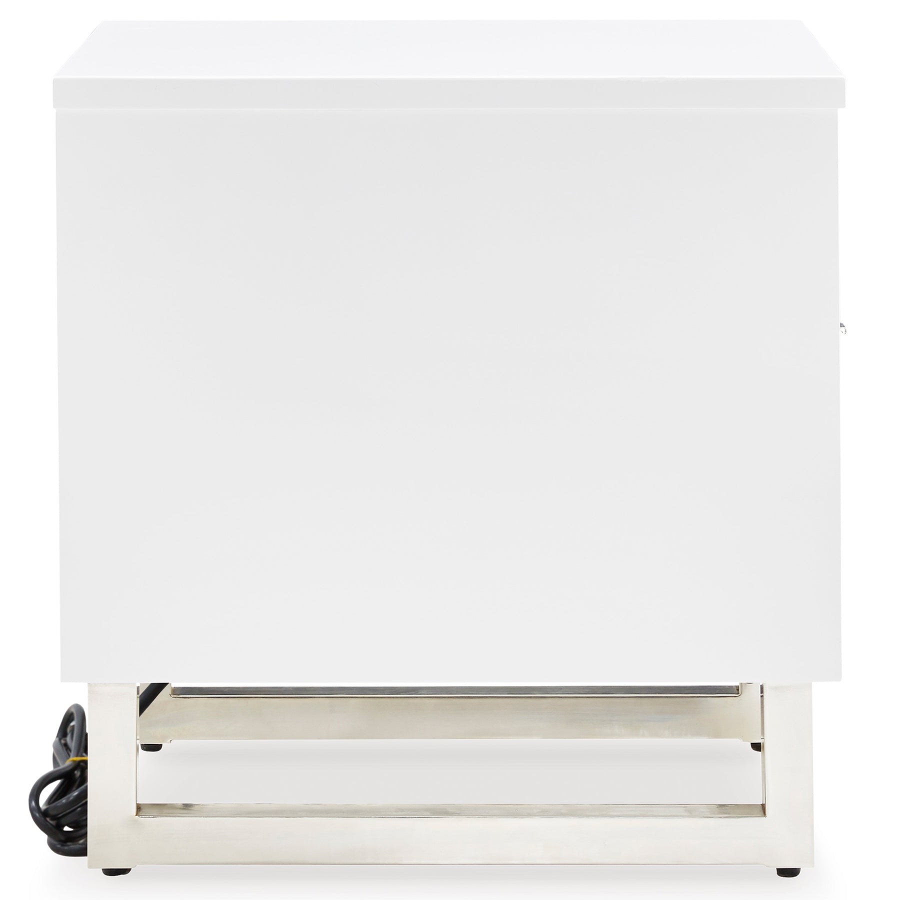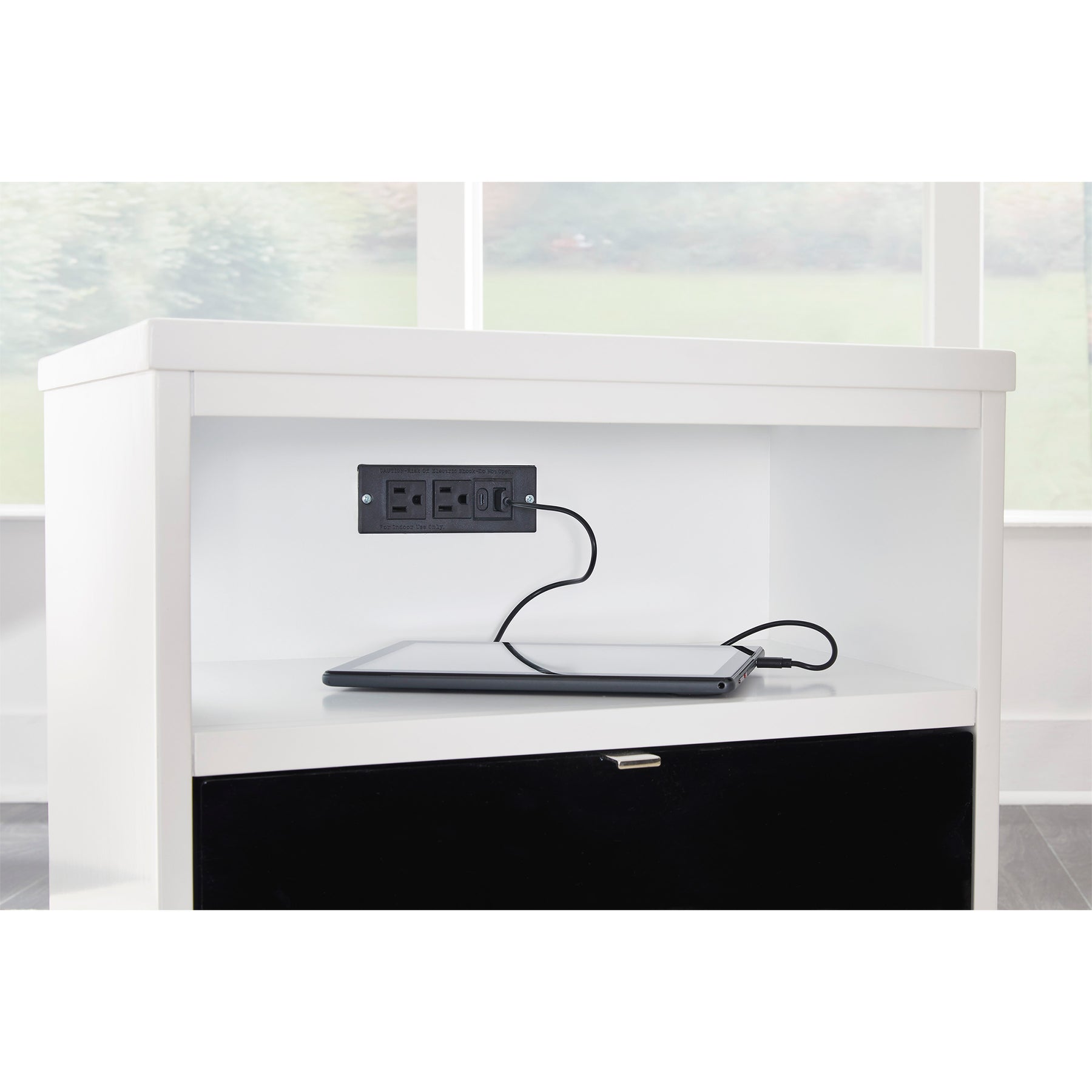 Details | Made with MDF substrates, High-gloss white finish, Black acrylic laminate drawer front, 1 smooth-gliding drawer, Open display shelf, Legs with chrome-tone finish, 110V power supply with USB-A and USB-C charging ports, Power cord included; UL Listed | |