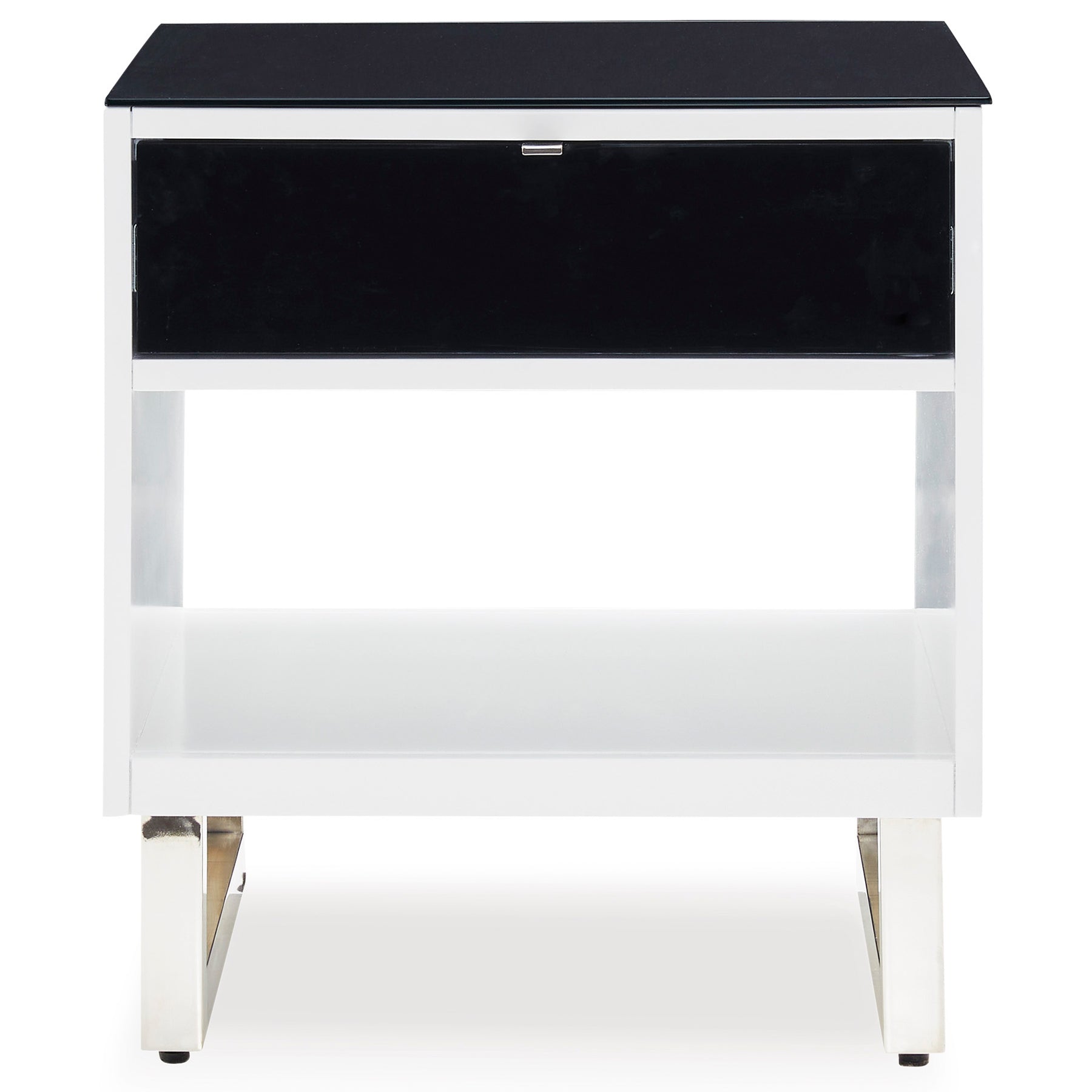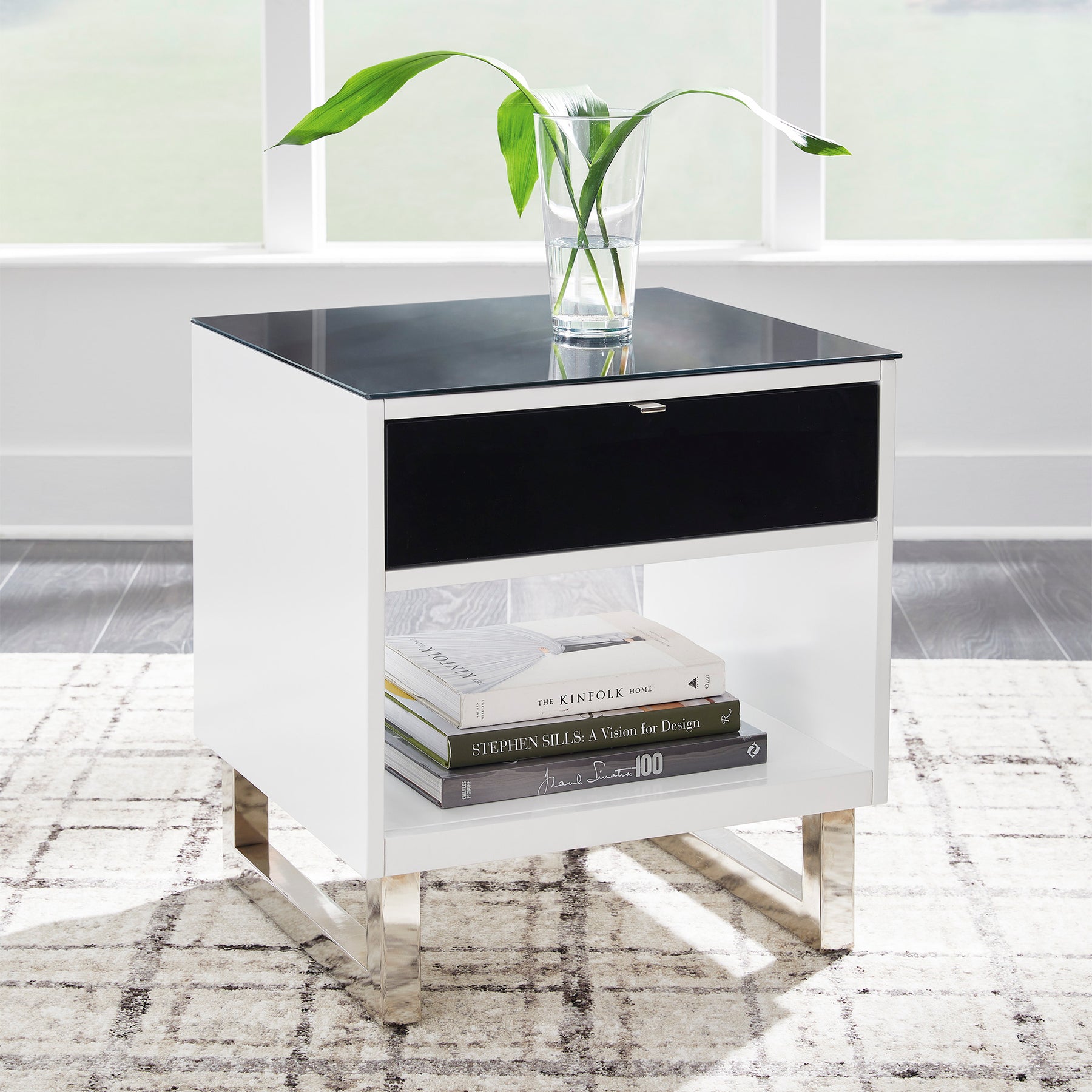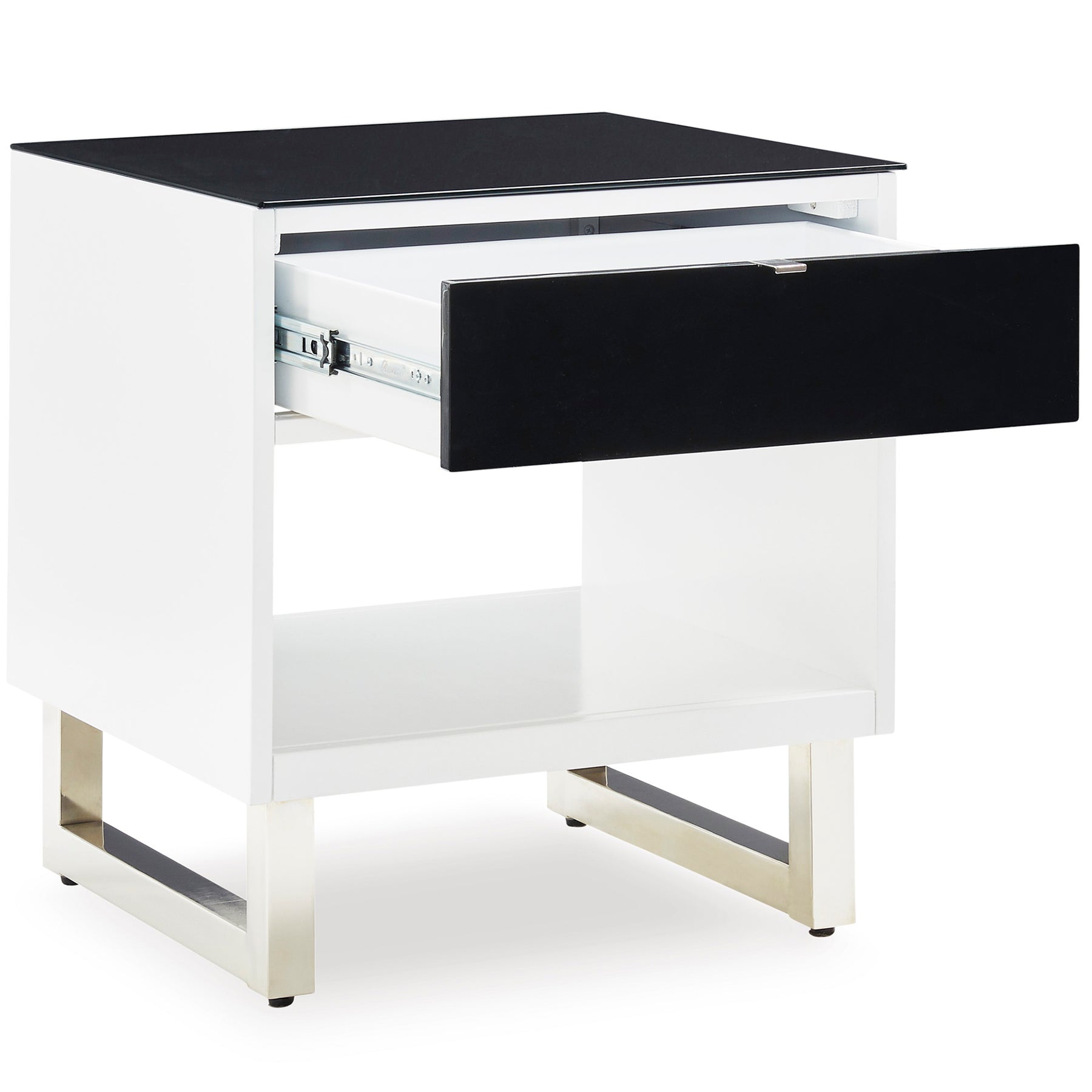 Details | Made with MDF substrates, High-gloss white finish, Black glass tabletop; black acrylic laminate drawer front, Smooth-gliding storage drawer, Open display shelf, Legs with chrome-tone finish | |
