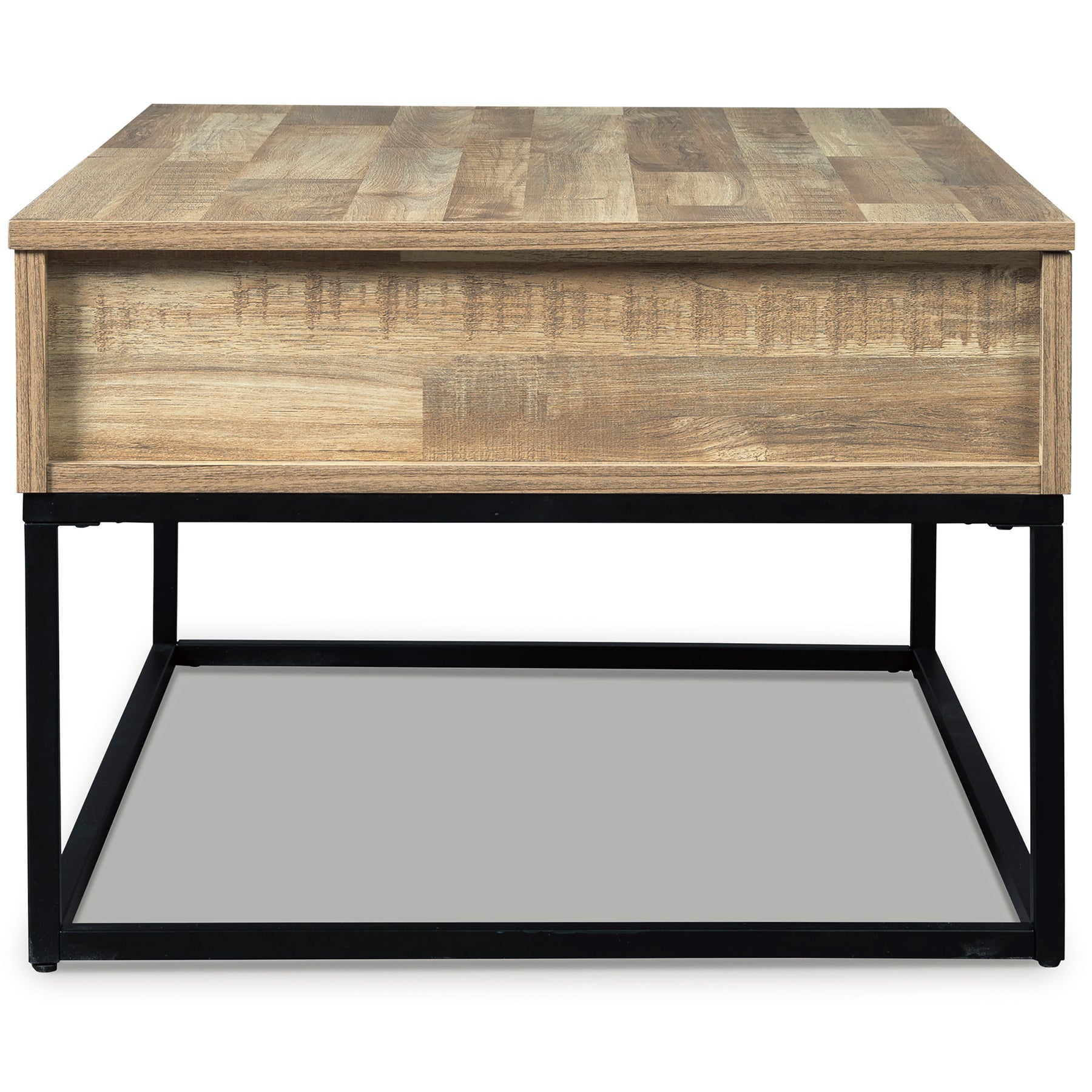 This cool cocktail table offers a fresh take on urban style with a casual lift top design and replicated butcher block finish. The metal base elevates the table and provides open space to add a lightness to your room.
