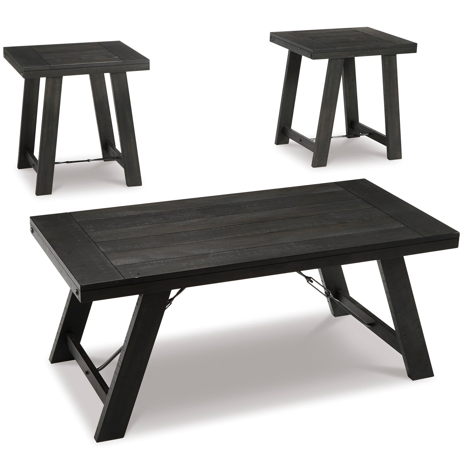 Details | Includes coffee table and 2 end tables, Made of Acacia veneers, wood and engineered wood, Distressed black wash finish, Canted legs with stretchers, Tops have a bread board layup with a planked effect, Coffee table with tension bars, Assembly required | |