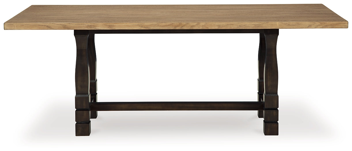 Details | Includes dining table and 8 chairs, Table made with acacia veneer, MDF substrate and solid pine, Chair made with solid hardwood, Table with rich dark brown finish on base; rustic light brown finish on top, Thick, plank-look tabletop with saw kerf distressing, Dining chair with contoured seat; front legs feature adjustable levelers, Table seats up to 8, Assembly required | |