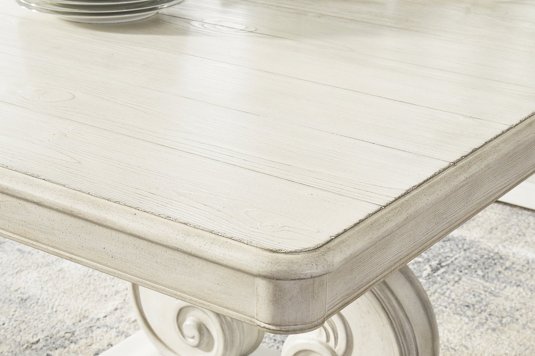 Details | Includes dining extension table and 8 chairs, Antiqued white painted finish, Table made with hardwood solids, spruce veneer, MDF substrates and cast resin components, 2 removable leaves included, Table extends by pulling both ends and dropping in leaf, Chairs made with hardwood frame and cast resin components, Light linen upholstery, Foam cushion, Assembly required | |