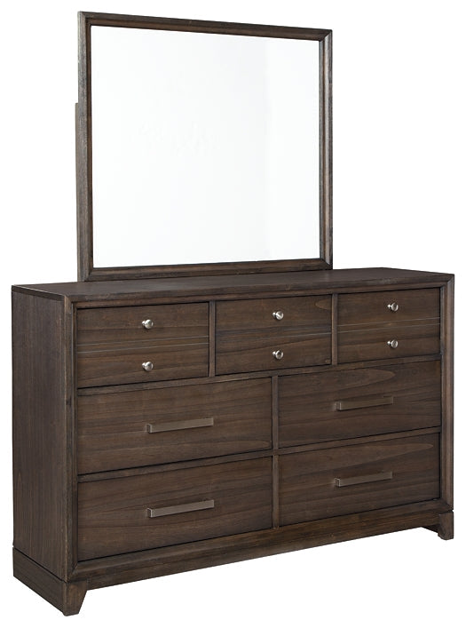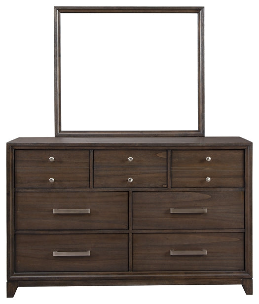 Details | Includes dresser with mirror, Made of wood, Mindi veneers and engineered wood, Chestnut brown finish with burnished edges and dark grain contrast, Brushed nickel-tone hardware, 7 smooth-gliding drawers with dovetail construction, Top drawers with felt lining, Mirror attaches to back of dresser, Assembly required | |