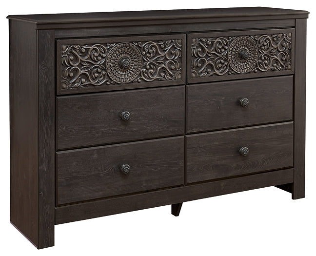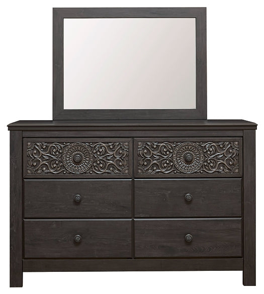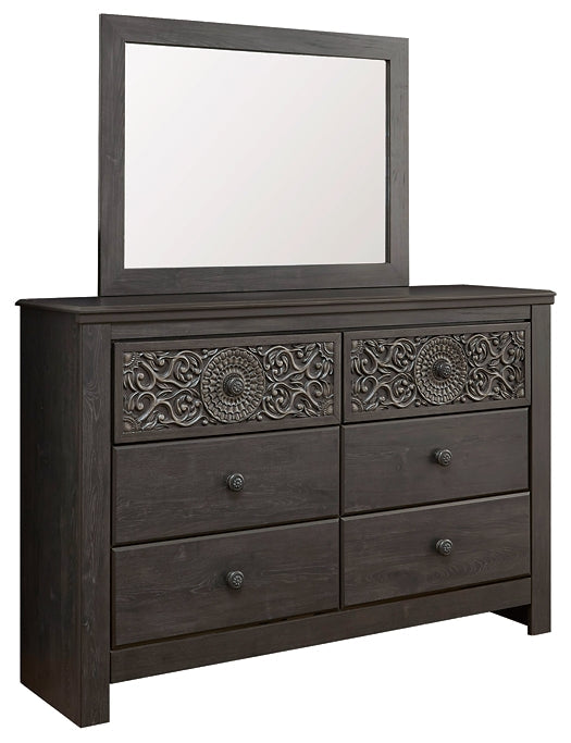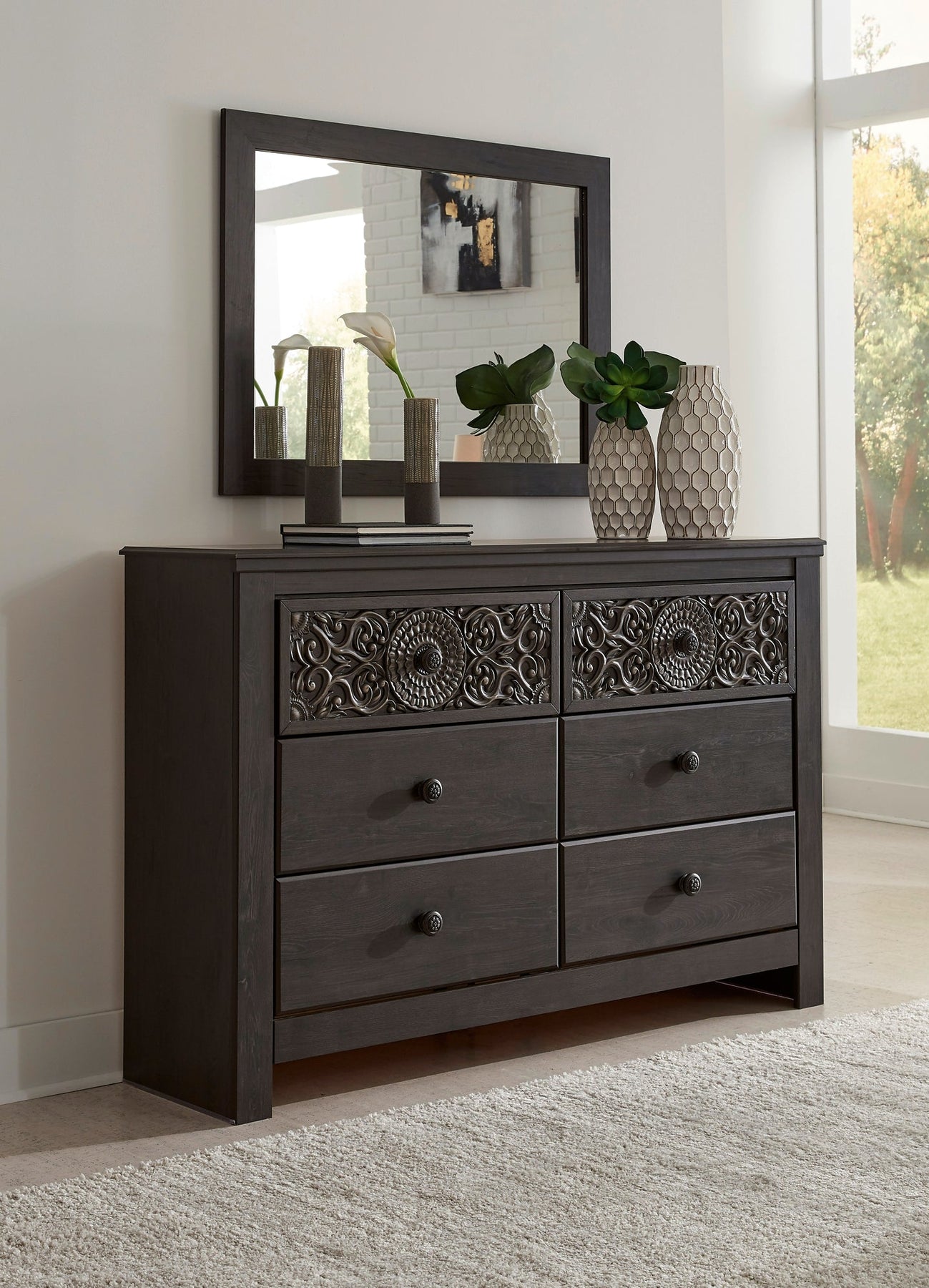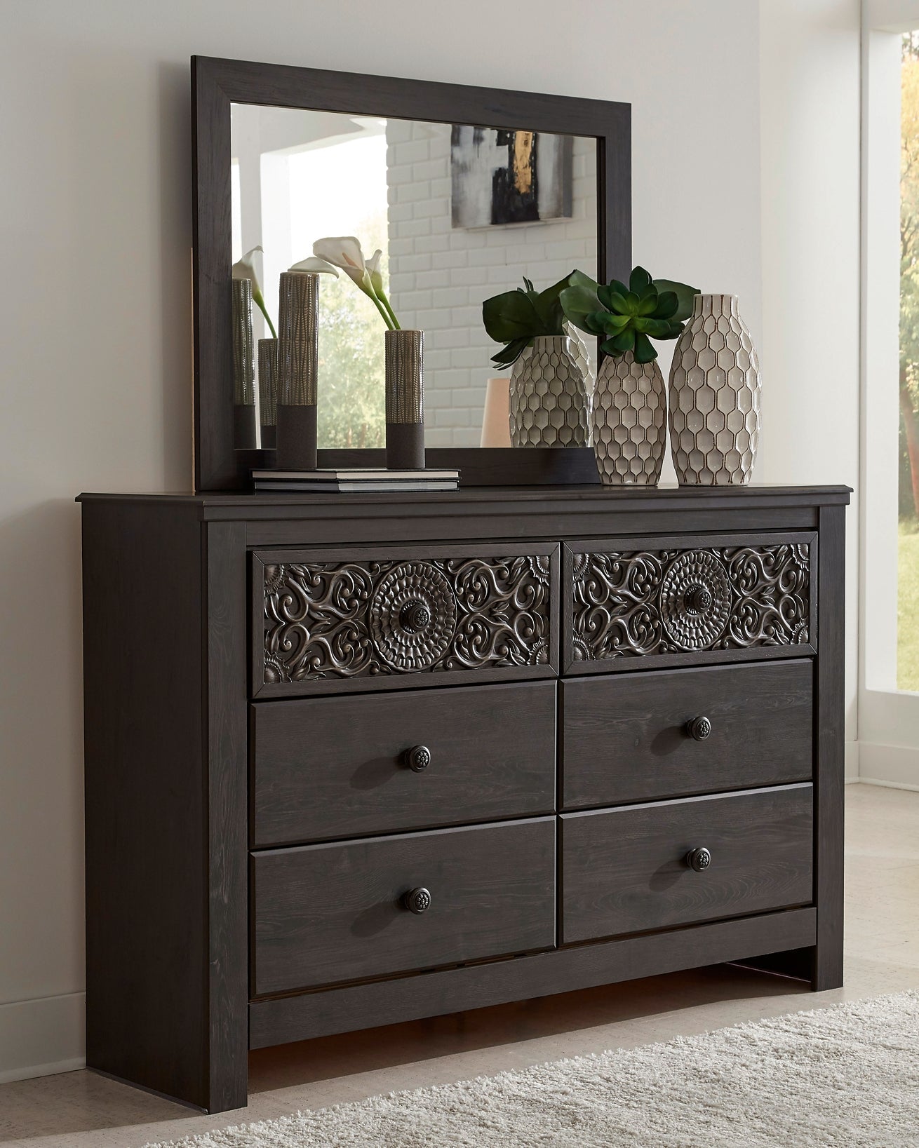 Details | Includes dresser and mirror, Made of engineered wood (MDF/particleboard) and decorative laminate, Vintage aged black/brown finish over replicated oak grain, Hardware features a worn-through painted effect, 6 smooth-gliding drawers with faux laminate lining, Mirror attaches to back of dresser, Safety is a top priority, clothing storage units are designed to meet the most current standard for stability, ASTM F 2057 (ASTM International), Drawers extend out to accommodate maximum access to drawer interior while maintaining safety, Assembly required | |