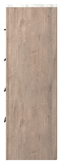 Details Made of engineered wood (MDF/particleboard), and decorative laminate, Dry, light finish with replicated oak grain and authentic, Replicated Calcutta marble top, 4 smooth-gliding drawers with faux linen lining, Large scale dark colored handles, Safety is a top priority, clothing storage units are designed to meet the most current standard for stability, ASTM F 2057 (ASTM International), Drawers extend out to accommodate maximum access to drawer interior while maintaining safety, Assembly required
