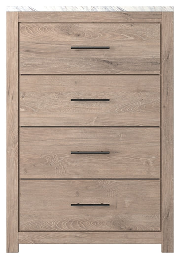 Cool, clean and casually modern. This chest’s light natural finish and faux Calcutta marble top set the tone for your calming sanctuary. Large linear pulls add dimension and authenticity. Four smooth-gliding drawers neatly accommodate your wardrobe needs.