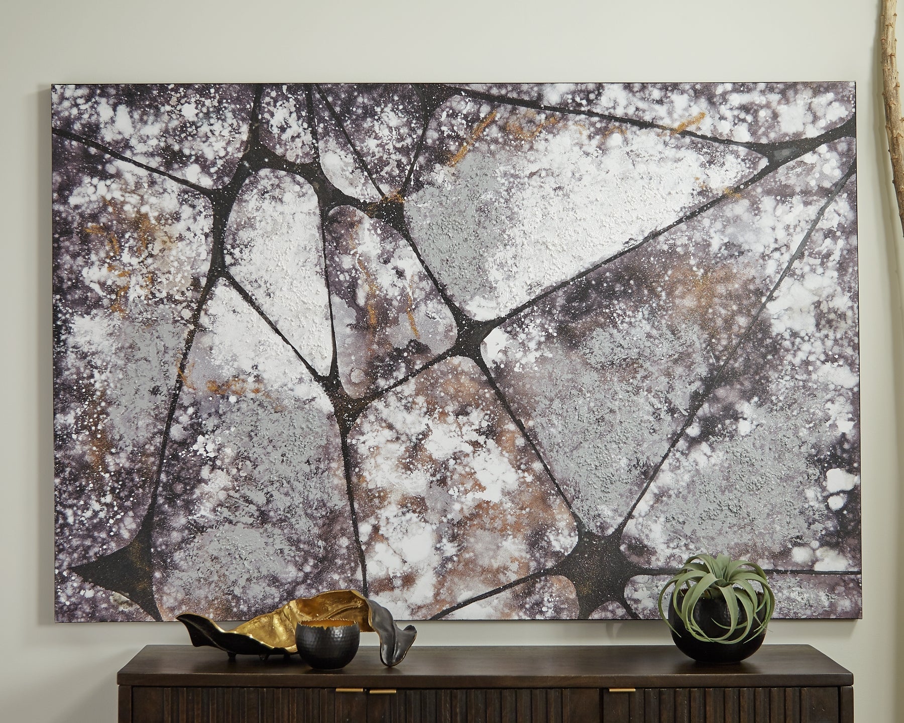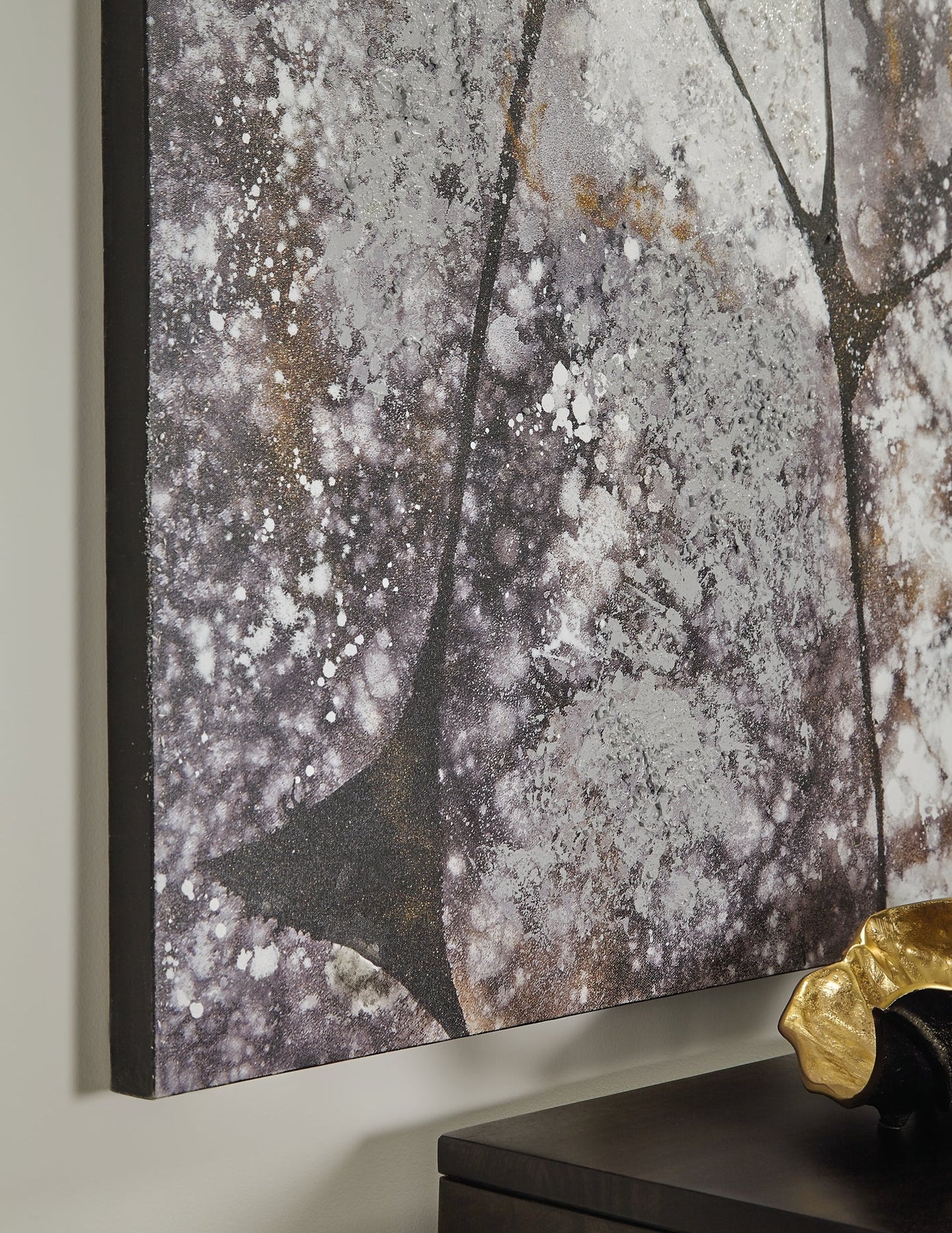 Details | Gallery wrapped canvas, Framed, Hand-painted in shades of black, white, gray, taupe and gold, D-ring bracket hanger, Hangs vertically or horizontally, Due to the handcrafted nature of this product, some variations may occur, Clean with a soft dry cloth | |