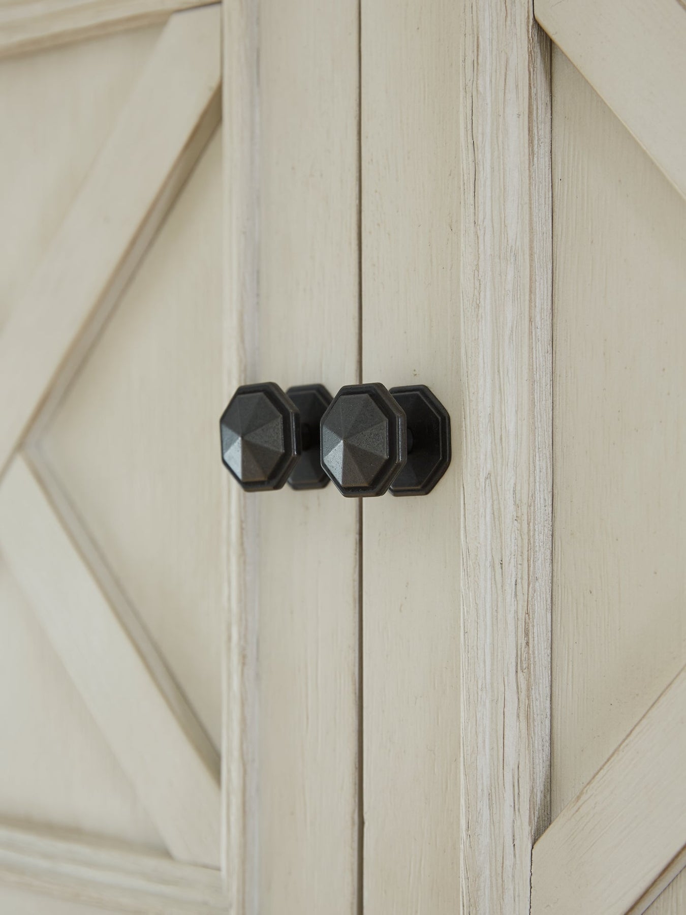 Details | Made of veneers, wood and engineered wood, Antiqued white finish, Gentle distressing, 3 shelves (2 adjustable and 1 fixed), Double door cabinet | |