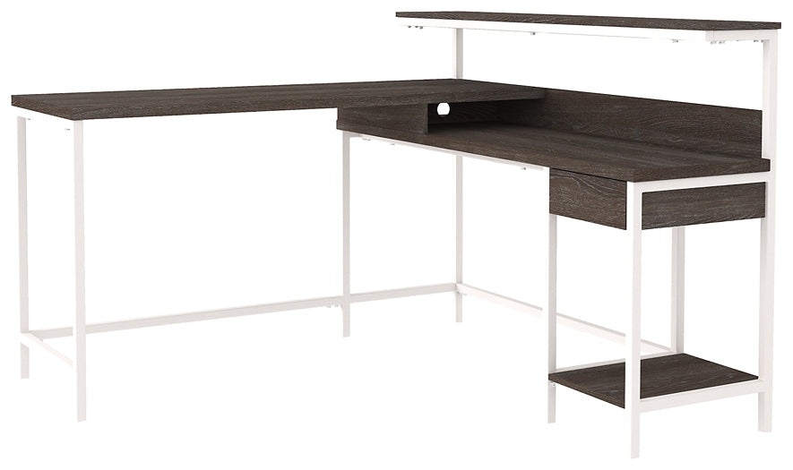 Details | Made of engineered wood and laminated paper, Two-tone treatment; replicated gray wood top with antiqued white base, Combined desk with shelf and return with drawer and fixed shelf, Convenient cubby for additional storage, Designed for easy cord management, Assembly required | |
