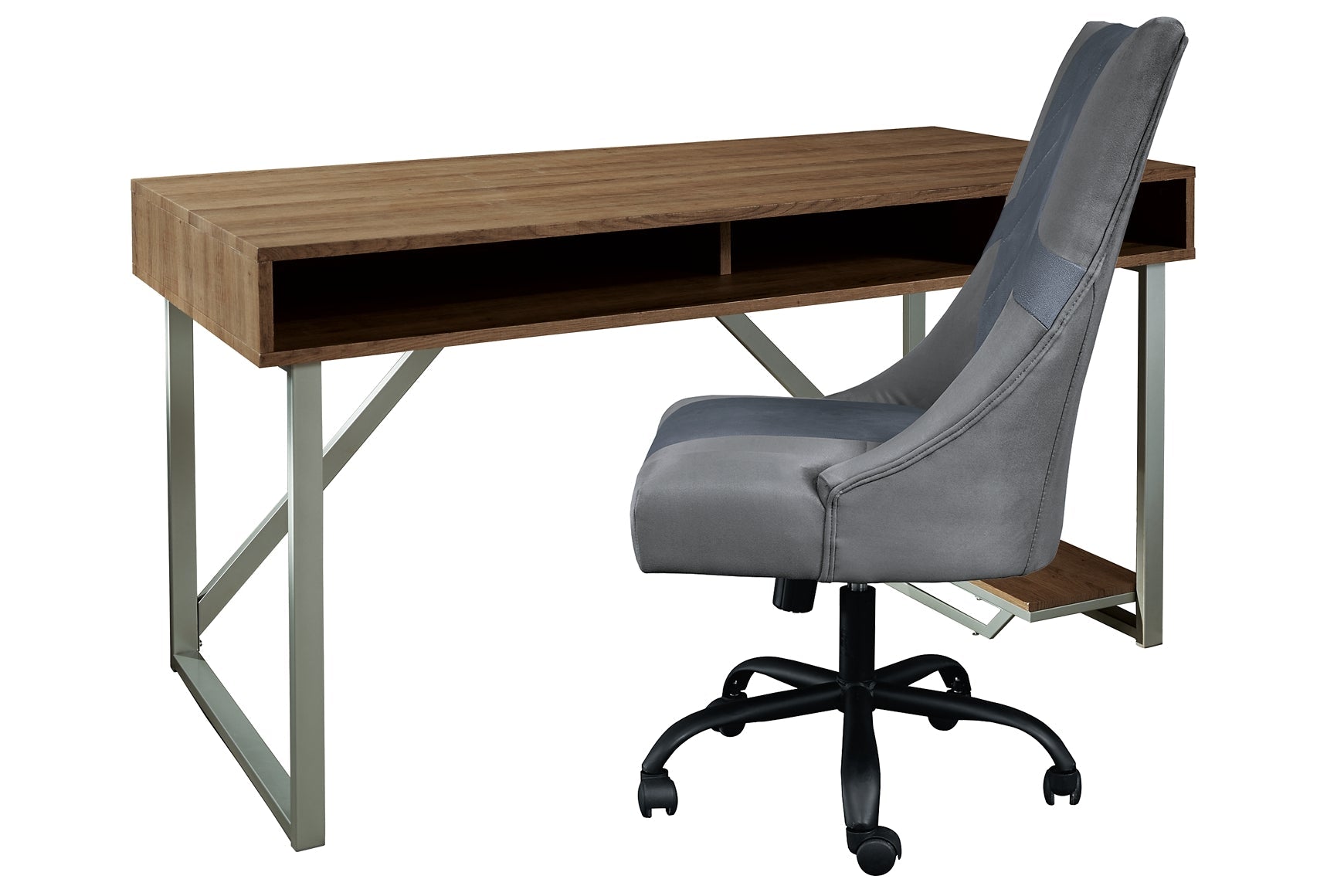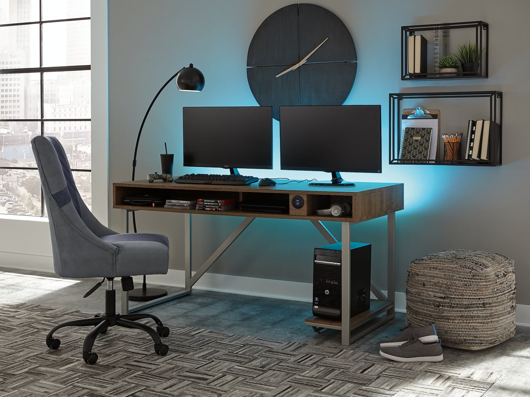 Details | Includes gaming desk and gaming chair, Desk with metal frame with silvertone finish, Open raceway for power cord management; LED backlight with multiple color options (includes remote control); dual USB charging port; PC stand; open storage cubby, Chair with foam cushioned seat, Adjustable seat height; tilting mechanism; 360-degree swivel; casters for easy movement, Assembly required | |