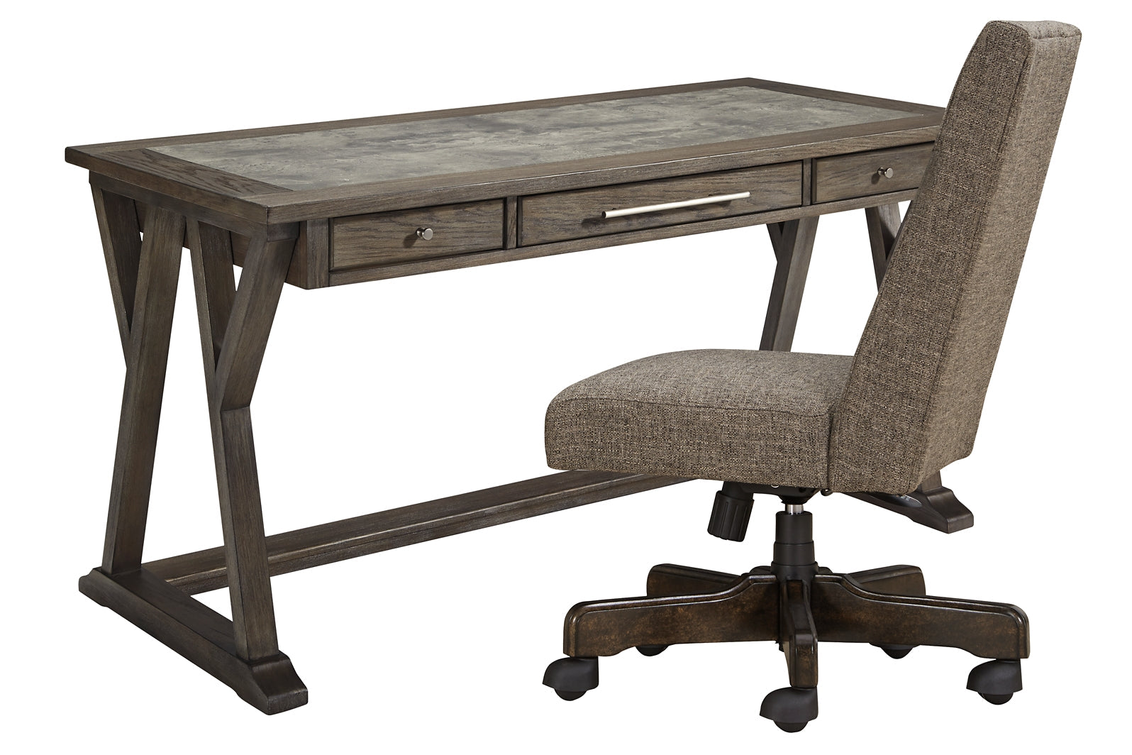 Details | Includes desk and swivel chair, Made of white oak veneer, wood, engineered wood, metal and plastic, Desk top with faux bluestone inset and wire brushed gray-brown finish with metallic undertones, 3 smooth-gliding drawers and brushed nickel-tone hardware, Chair with metal, plastic and wood base, Cushioned seat with button-tufted polyester upholstery , Smooth 360-degree swivel; casters for easy movement; adjustable seat height with manual lift, Assembly required | |