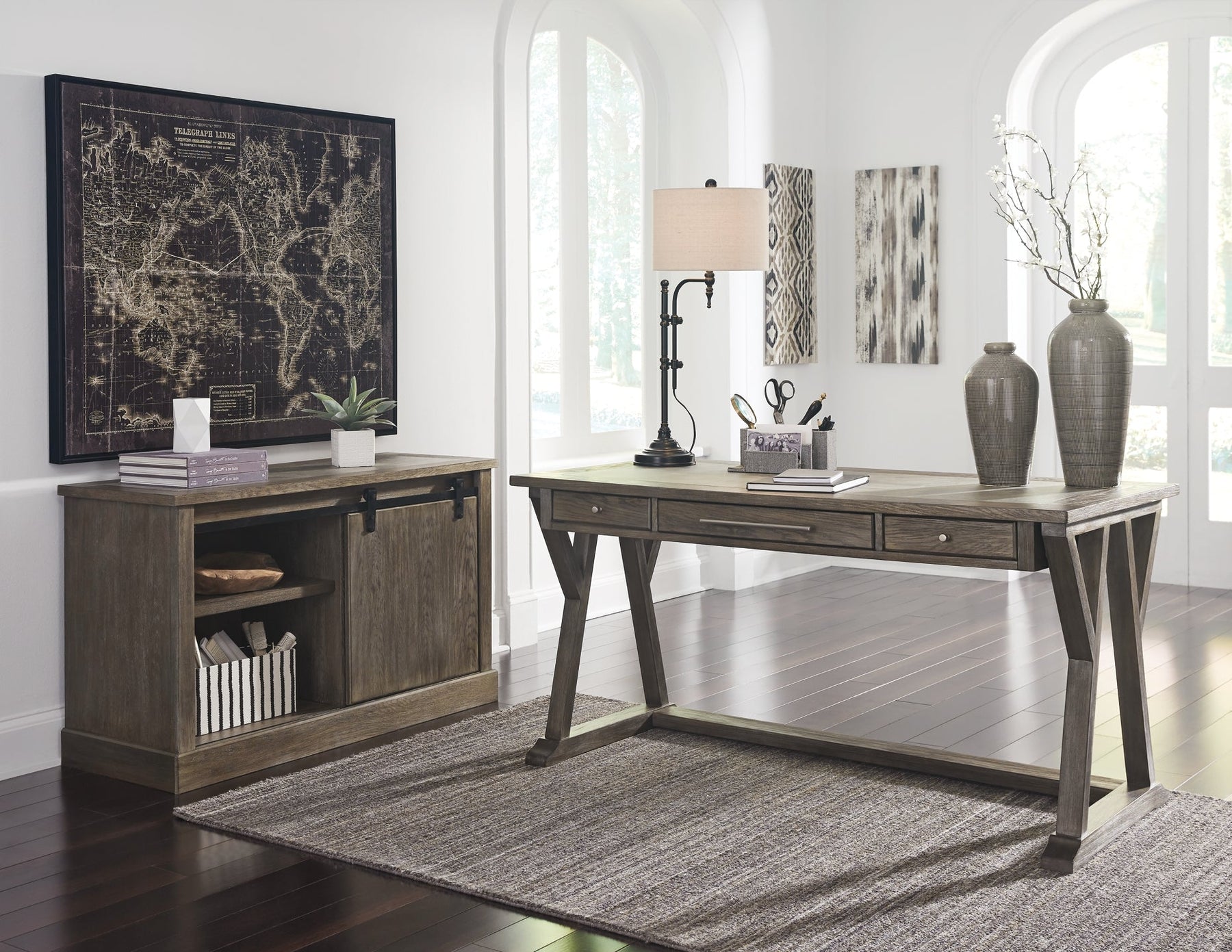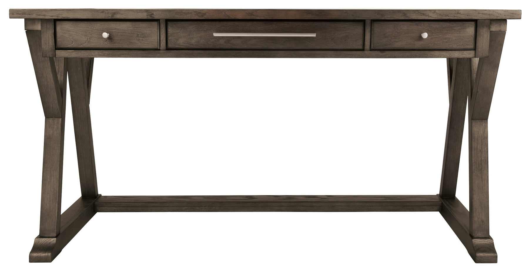 Details | Made of white oak veneers, wood and engineered wood, Desk top with faux bluestone inset, Wire brushed gray-brown finish with metallic undertones, 3 smooth-gliding drawers, Brushed nickel-tone hardware, Assembly required | |