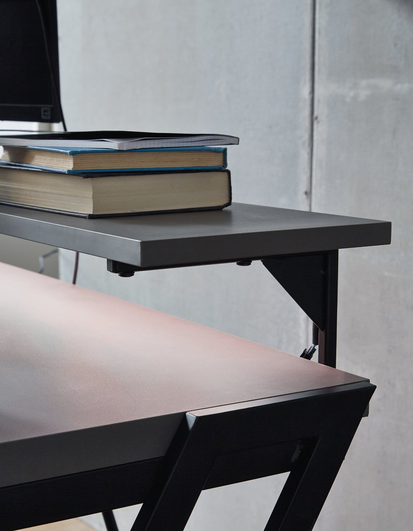 Details | Made of metal and engineered wood, Solid gray melamine surface with trackable inset PVC panels, Metal frame with black powder coated finish, Integrated cup holder, Custom headset hanger, Raised monitor stand with LED light strip and remote control, AC outlets with dual USB charging ports, Power cord included; UL Listed, Assembly required | |