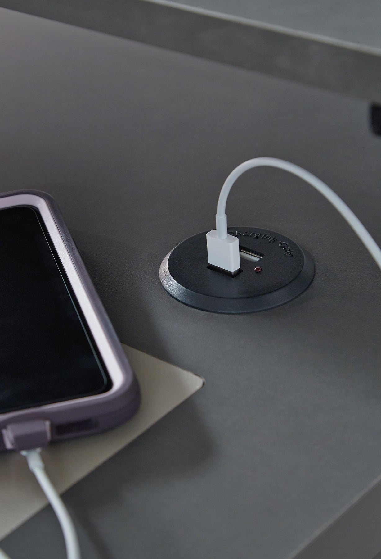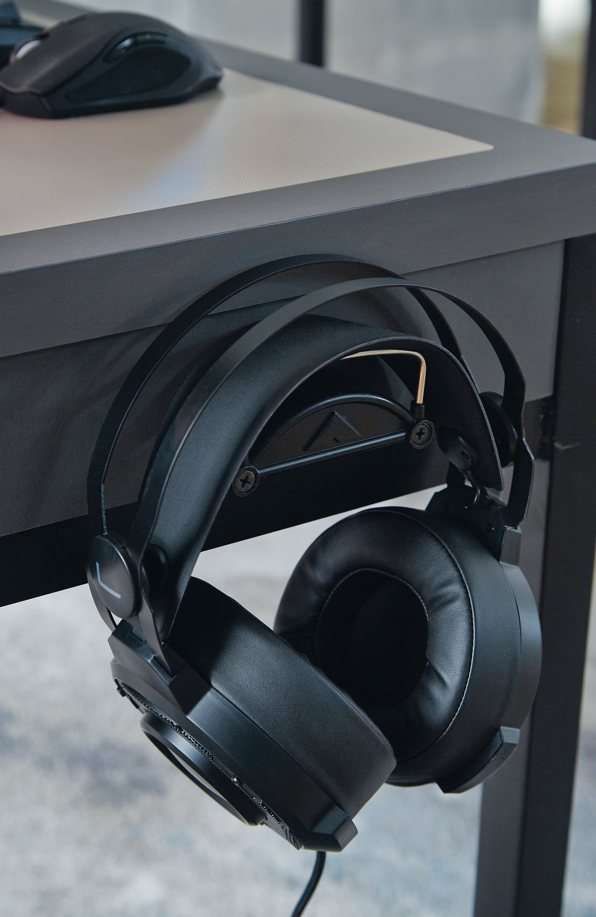Details | Made of metal and engineered wood, Solid gray melamine surface with trackable inset PVC panels, Metal frame with black powder coated finish, Integrated cup holder, Custom headset hanger, Raised monitor stand with LED light strip and remote control, Dual USB charging ports and wireless charging capability, Power cord included; UL Listed, Assembly required | |
