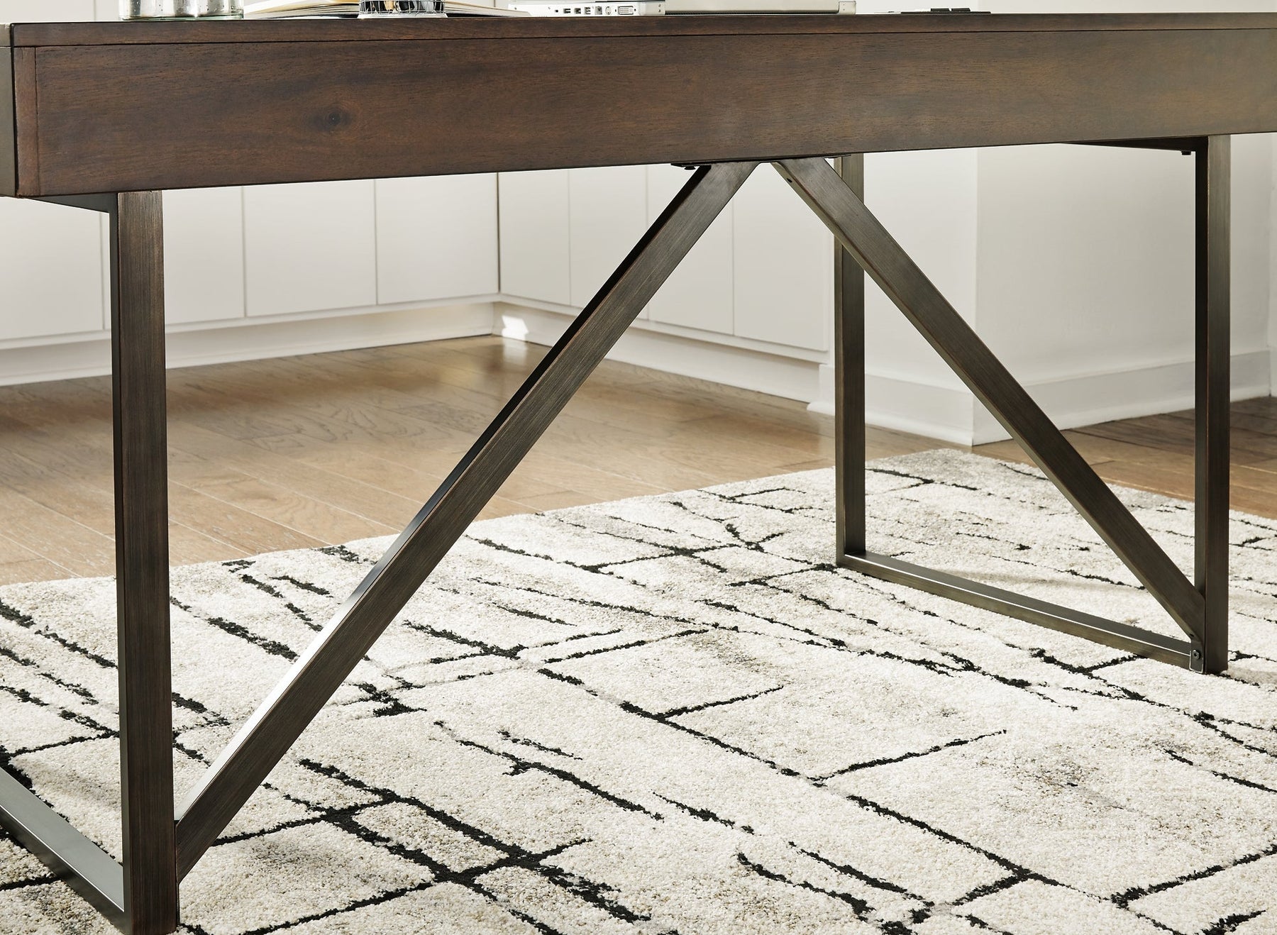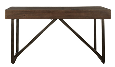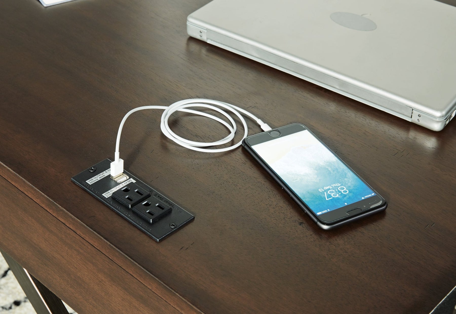 Details | Top made of acacia veneers, solid wood components and engineered wood in oil-rubbed walnut finish, Metal base and hardware in bronze-tone finish, Top made of acacia veneers, wood and engineered wood in oil-rubbed walnut finish, Metal base and hardware in bronze-tone finish, Drop-front keyboard tray/drawer, plus smooth-gliding drawer, Built-in power station with 2 AC electrical plug-ins and 2 USB slots, Power cord included; UL-listed, Assembly required | |