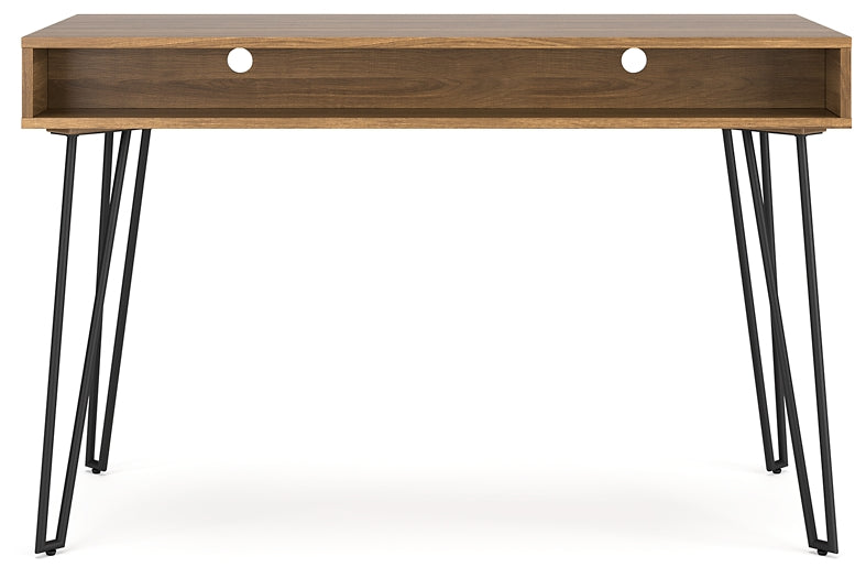 Details | Made with engineered wood and melamine laminate, Replicated light brown oak wood grain, Metal legs with black finish, 2 open storage areas, Open raceway for power cord management, Assembly required | |