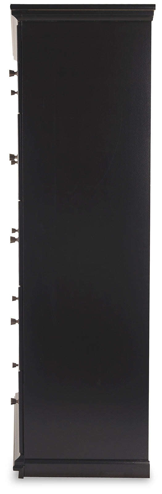 Details | Made of wood and engineered wood (MDF/particleboard), Antiqued black finish, Rubbed dark metal hardware, 5 smooth-gliding drawers, Includes tipover restraint device, Small Space Solution, Safety is a top priority, clothing storage units are designed to meet the most current standard for stability, ASTM F 2057 (ASTM International), Drawers extend out to accommodate maximum access to drawer interior while maintaining safety | |