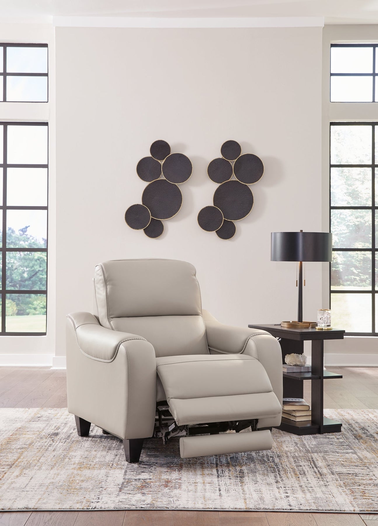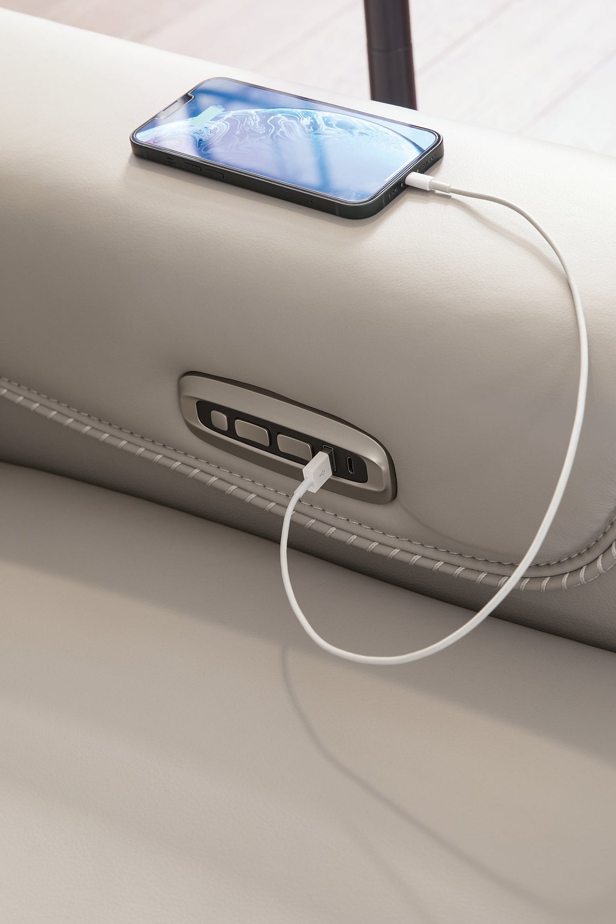Details | One-touch power control with adjustable positions, Easy View™ adjustable headrest, USB-C fast charging and zero-draw USB port, Zero-draw technology only consumes power when the USB receptacle is in use, Zero-gravity mechanism allows optimum reclining comfort with infinite reclining positions at the touch of a button, Corner-blocked frame with metal reinforced seat, Attached cushions, High-quality foam cushions wrapped in poly fiber, 100% top grain leather covers inside areas such as the back, seat and arm cushions; skillfully matched faux leather covers the remaining areas, Due to its natural origin, real leather can show individual characteristics such as healed scars, growth marks, grain variation and shade variation, Natural variations make each hide unique and do not detract from the wearing qualities of leather, Zero wall recliner design requires minimal space between wall and chair back, Exposed feet with faux wood finish, Power cord included; UL Listed | |