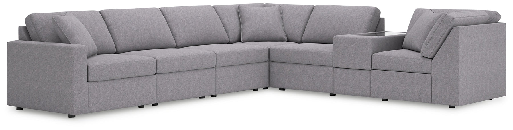 Includes 7 modular pieces: left-arm facing corner chair, 3 armless chairs, console with storage and 2 wedges, "Left-arm" and "right-arm" describe the position of the arm when you face the piece, Modular pieces can float anywhere; sides are finished (with no connectors), Corner-blocked frame, Loose reversible seat and back cushions; high-quality foam cushions wrapped in poly fiber, Throw pillows included; soft polyfill, Polyester upholstery, Next-Gen Nuvella™ is a family-friendly fabric that is soft, easy to clean, stain-resistant and durable; easy-to-remove zippered covers for machine washing, Clean fabric with mild soap and water, let air dry; for stubborn stains, use a solution of 4 oz. bleach to 28 oz. water, Non-skid legs, Console with removable plexiglass top; pull-out drawer for storage, Platform foundation system resists sagging 3x better than spring system after 20,000 testing cycles by providing more even support, Smooth platform foundation maintains tight, wrinkle-free look without dips or sags that can occur over time with sinuous spring foundations |